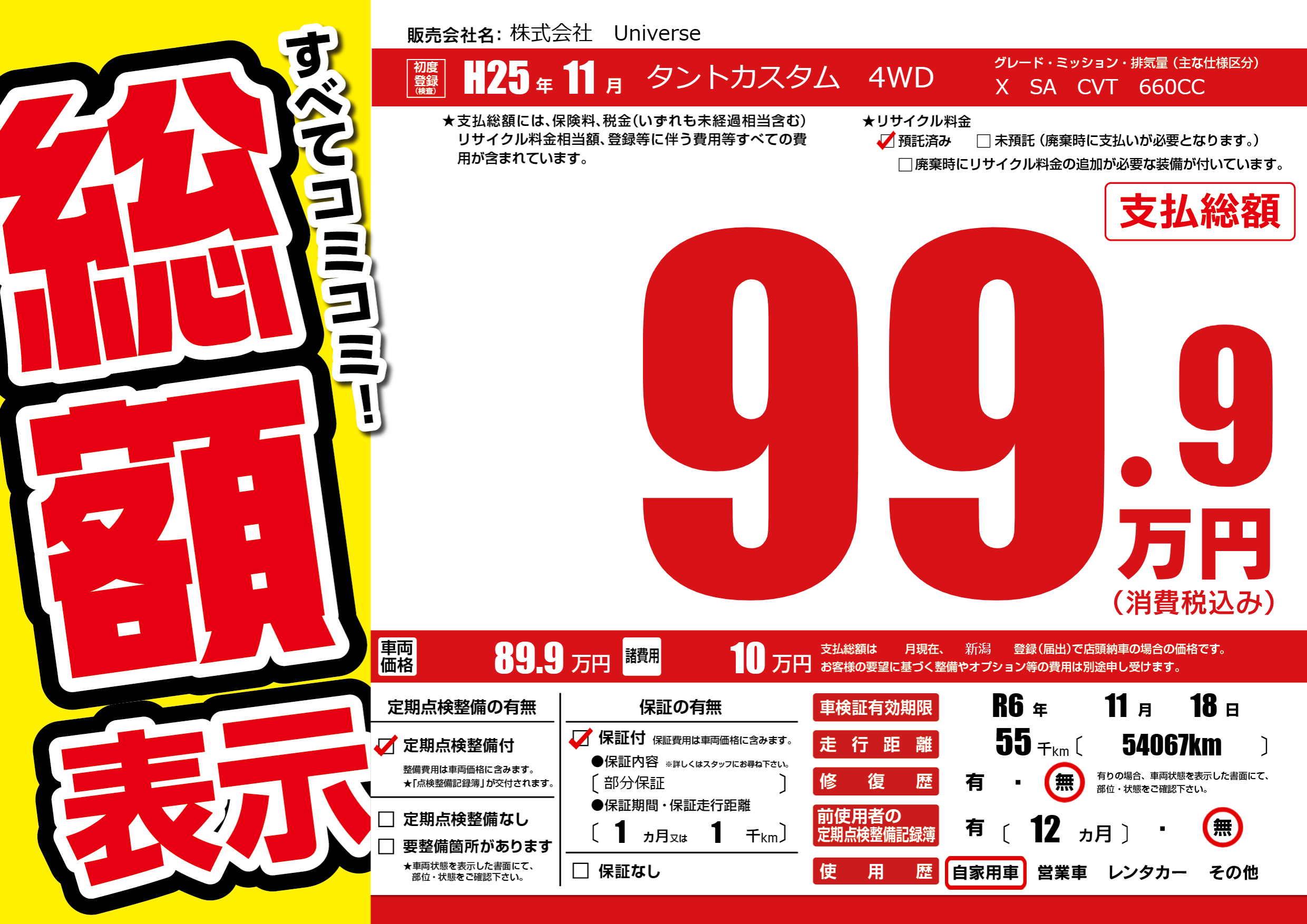 | 車名 | タントカスタム 4WD | グレード ミッション 排気量 |