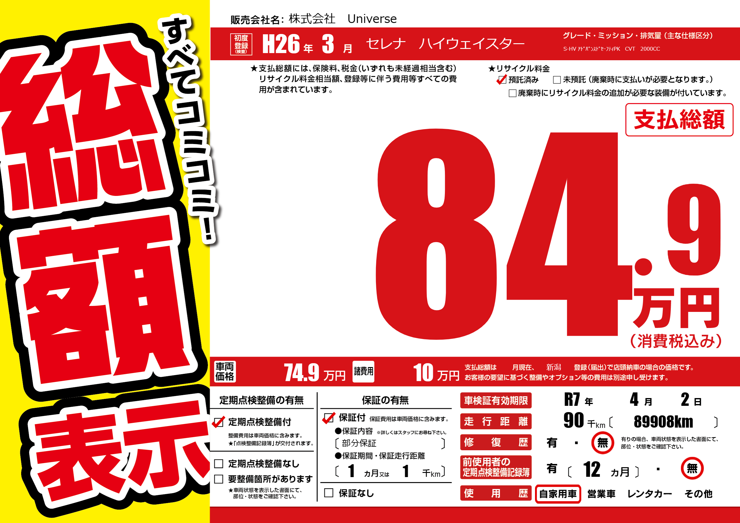 | 走行キロ | 9万km | 初年度登録 | H26年3月 |