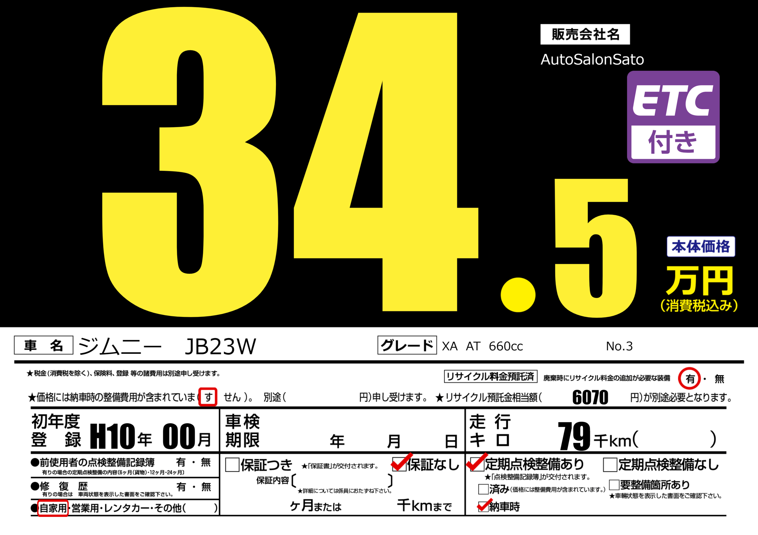 | 車名 | ジムニー JB23W | グレード ミッション 排気量 |