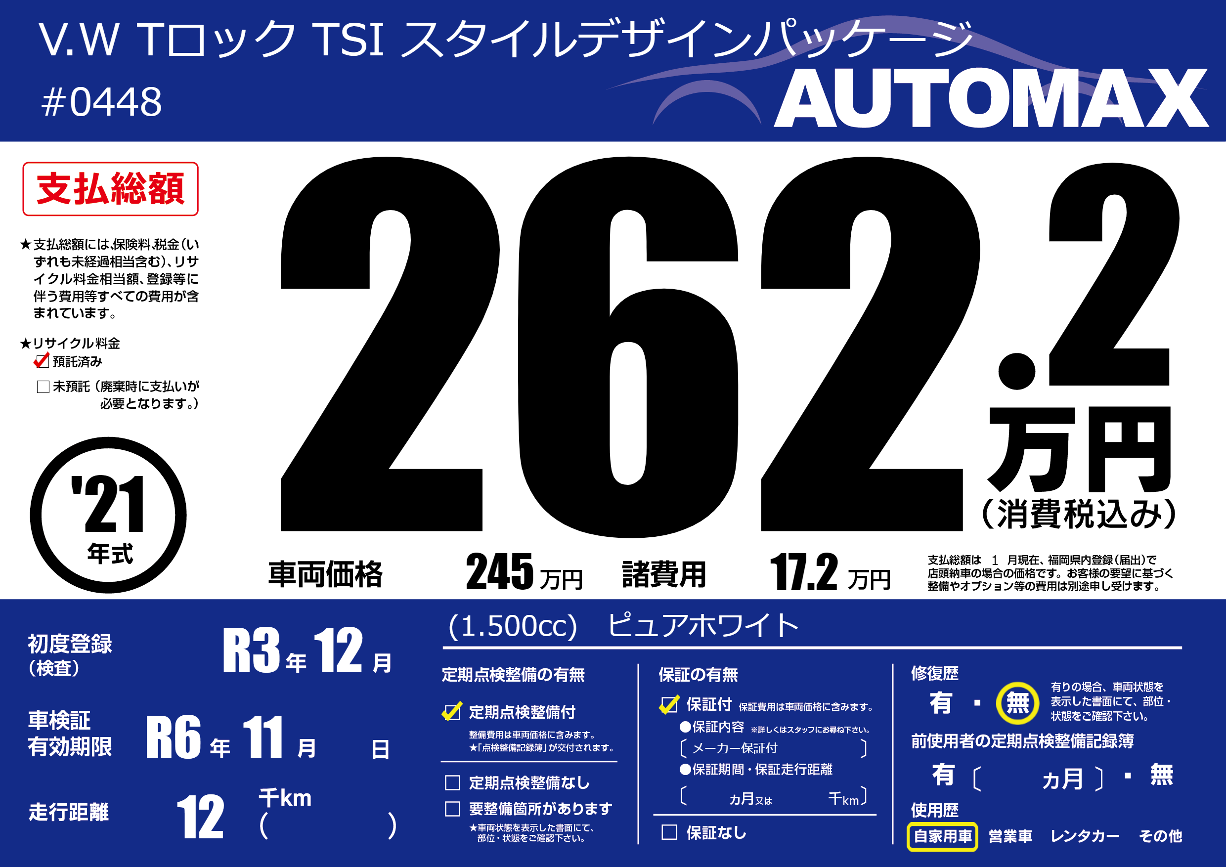 | 車名 | V.W Tロック TSI スタイルデザインパッケージ | グレード ミッション 排気量 |