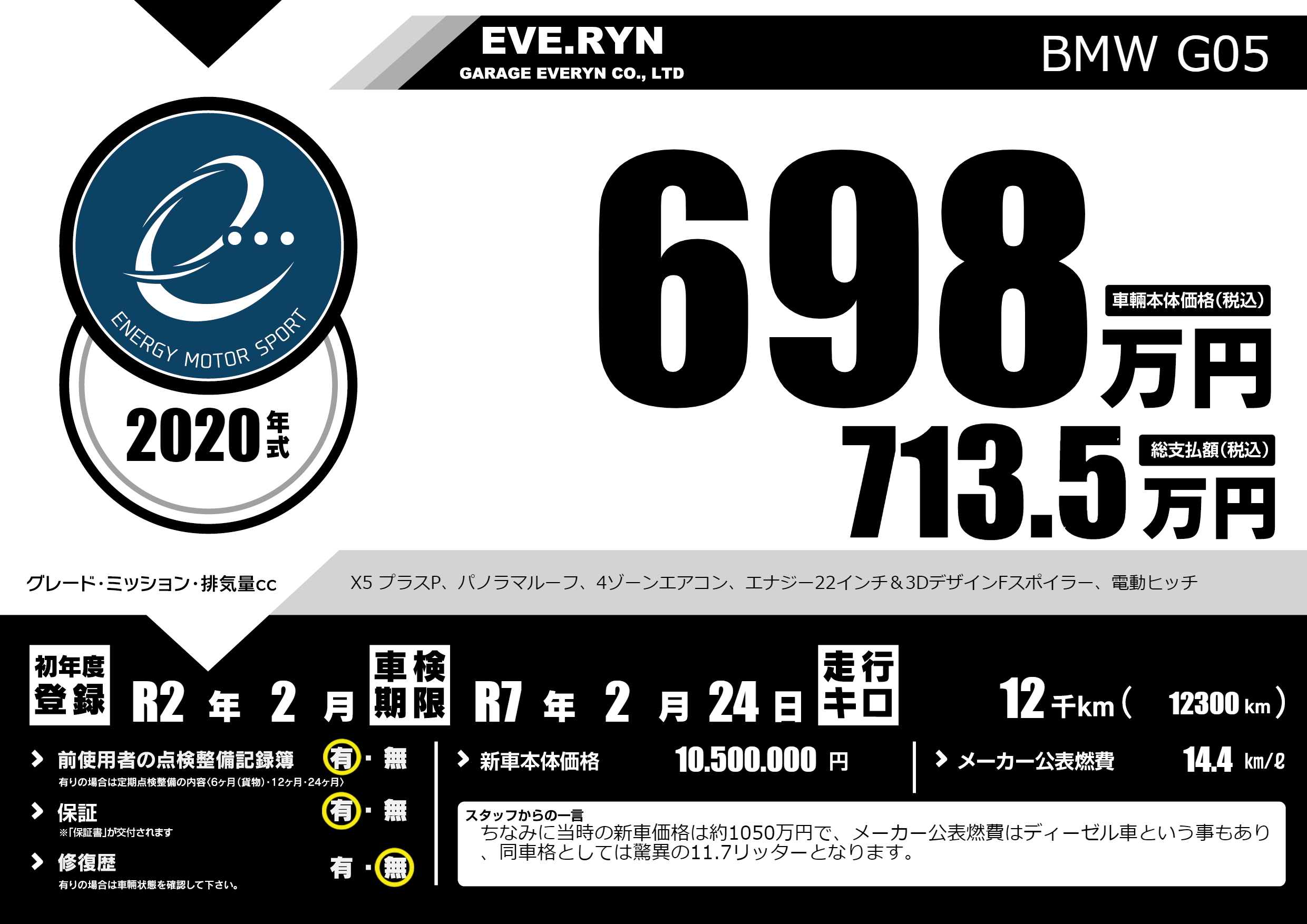 | 車名 | BMW G05 | グレード ミッション 排気量 |