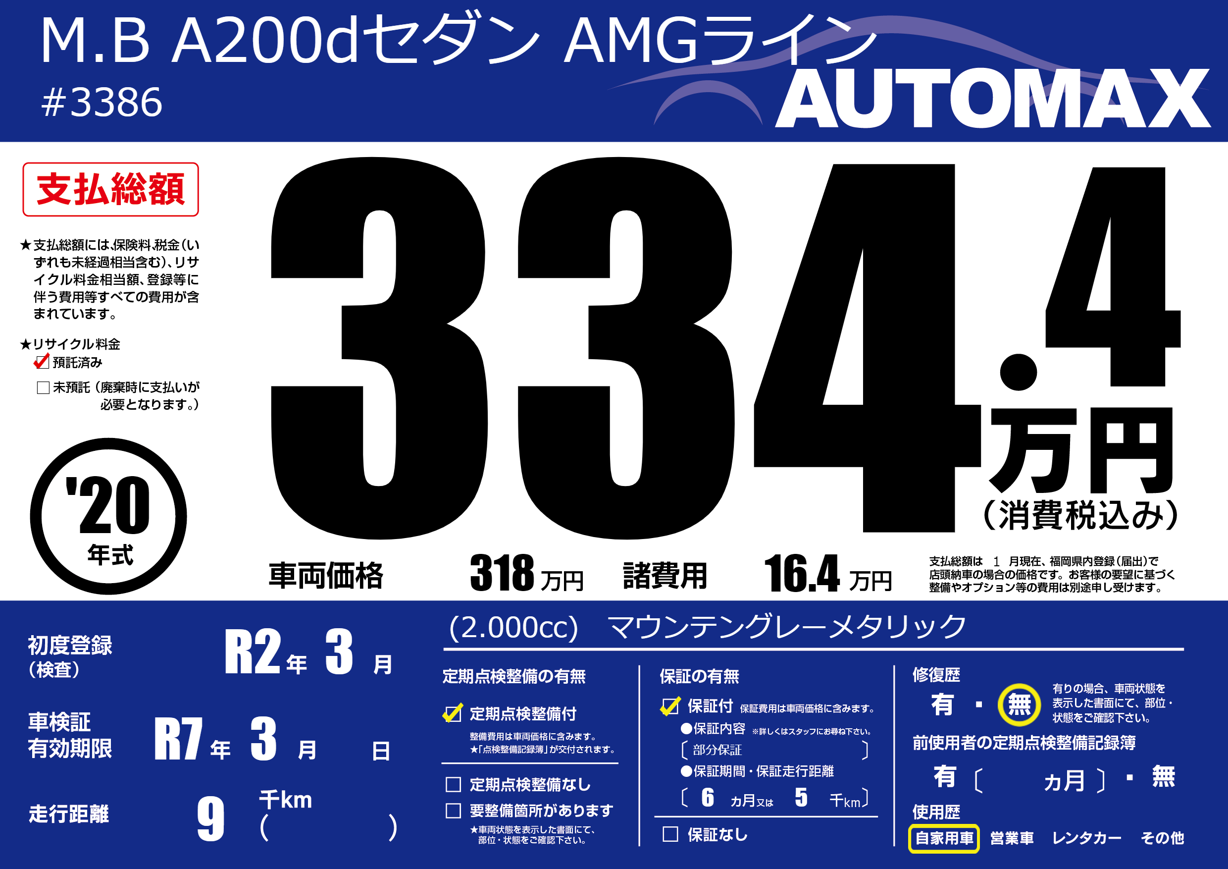 | 車名 | M.B A200dセダン AMGライン | グレード ミッション 排気量 |