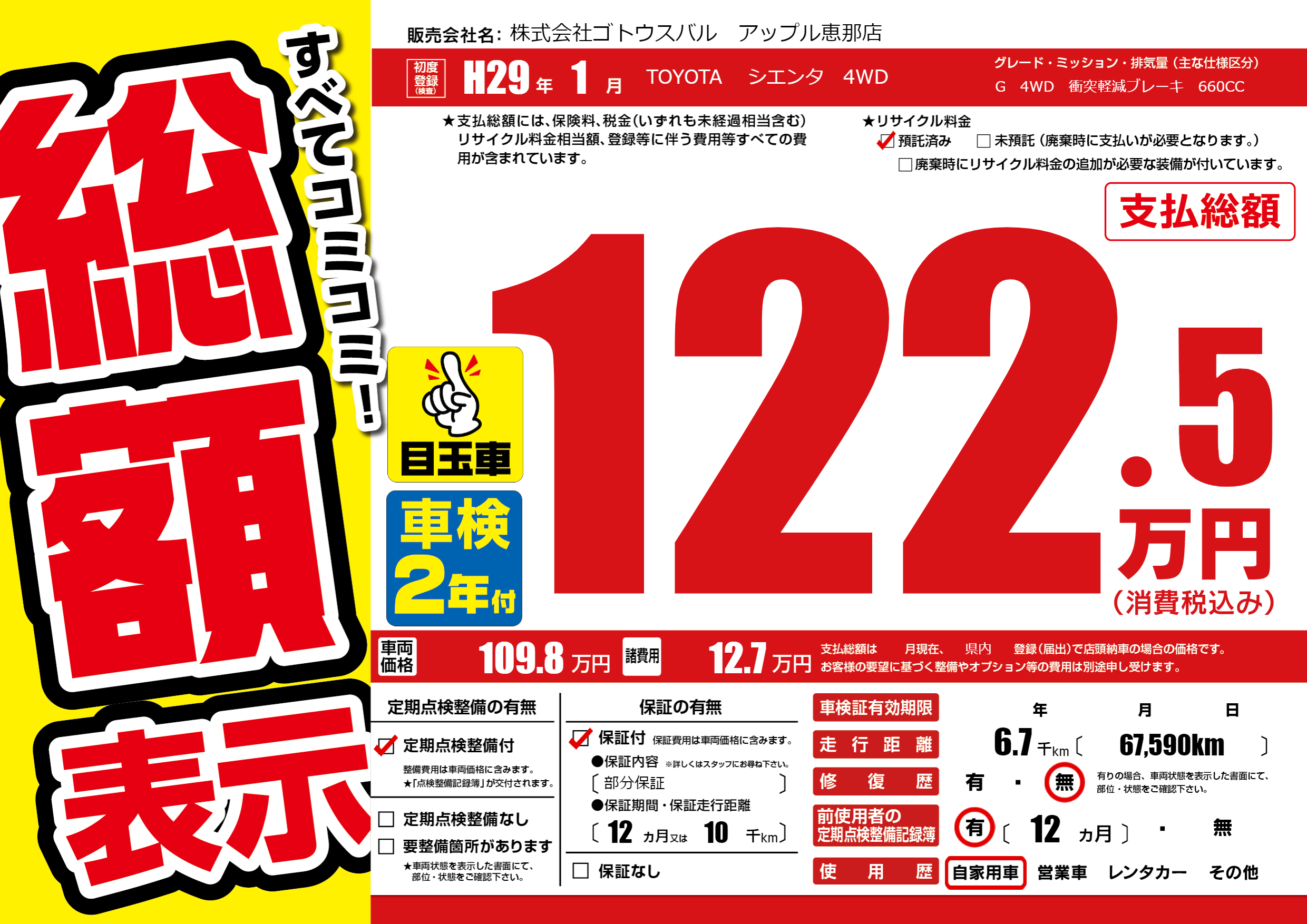 | 車名 | TOYOTA シエンタ 4WD | グレード ミッション 排気量 |