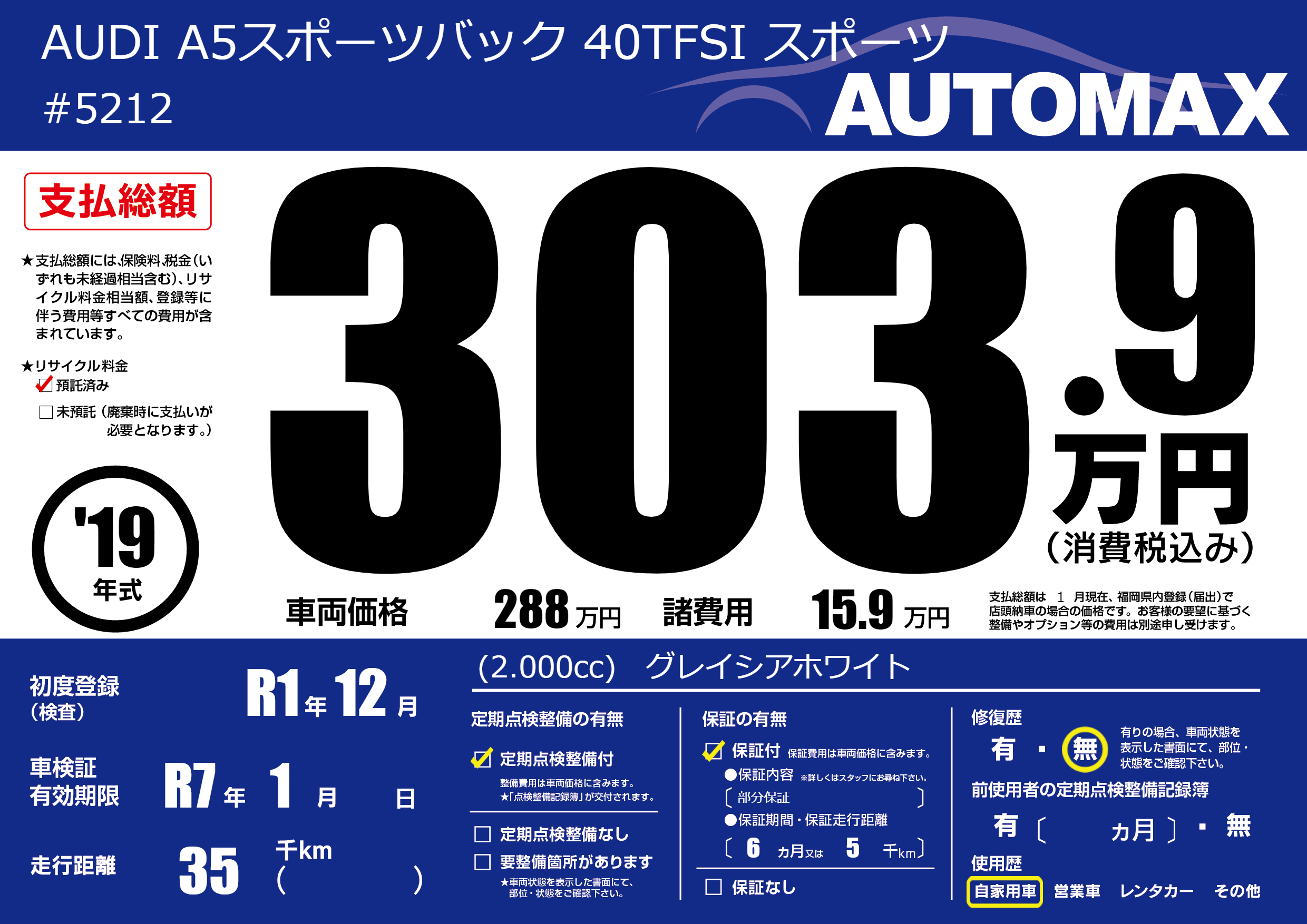 | 車名 | AUDI A5スポーツバック 40TFSI スポーツ | グレード ミッション 排気量 |
