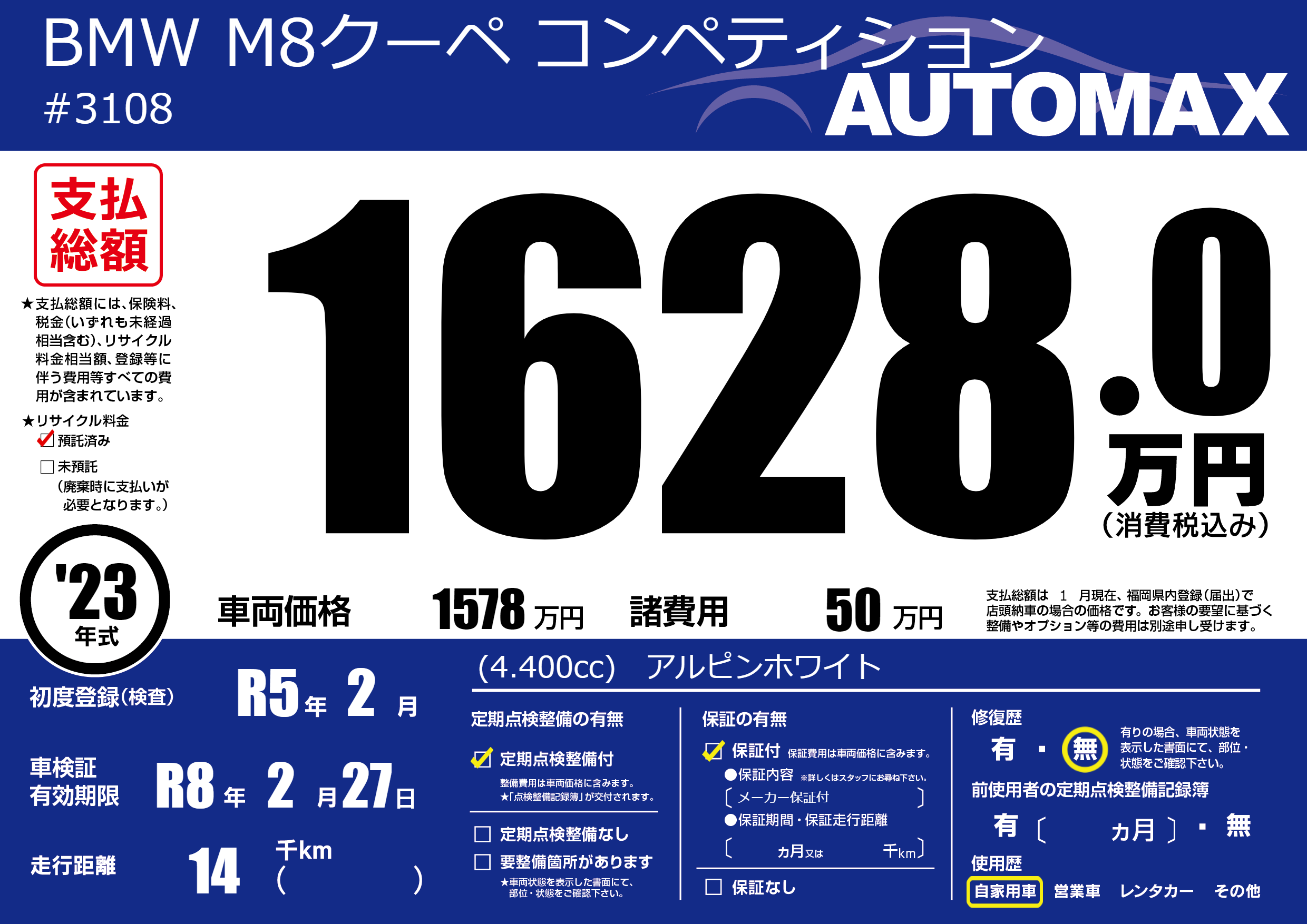 | 車名 | BMW M8クーペ コンペティション | グレード ミッション 排気量 |