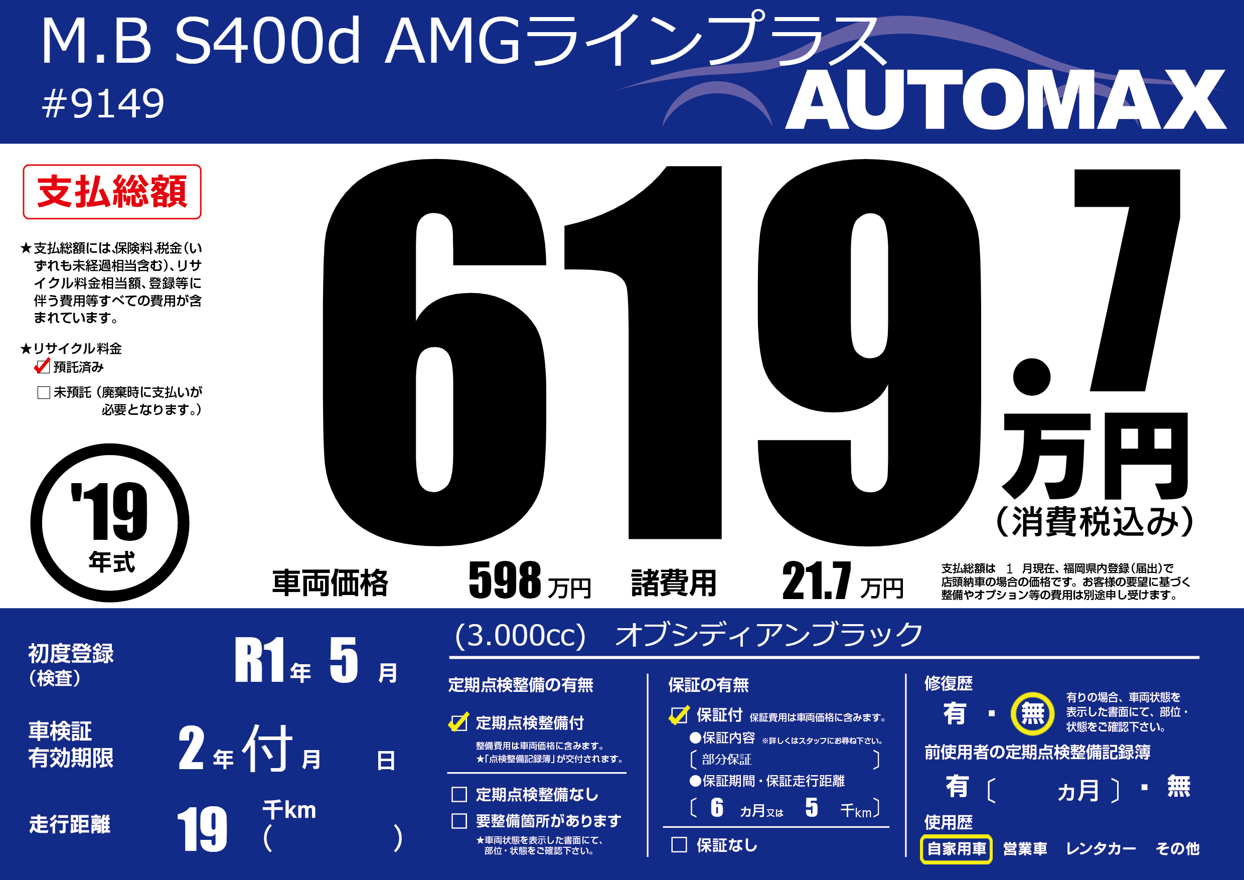 | 車名 | M.B S400d AMGラインプラス | グレード ミッション 排気量 |