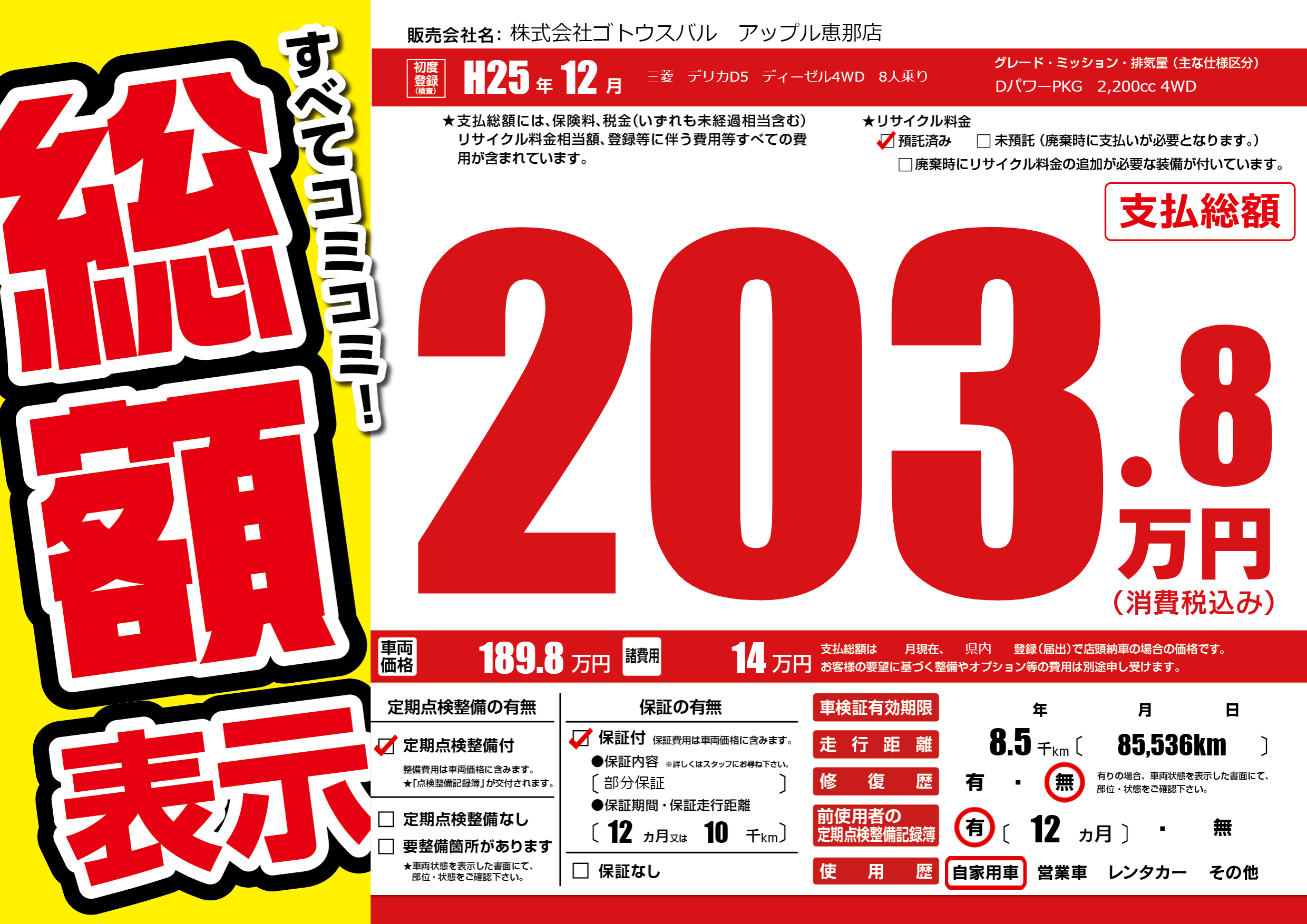 | 車名 | 三菱 デリカD5 ディーゼル4WD 8人乗り | グレード ミッション 排気量 |