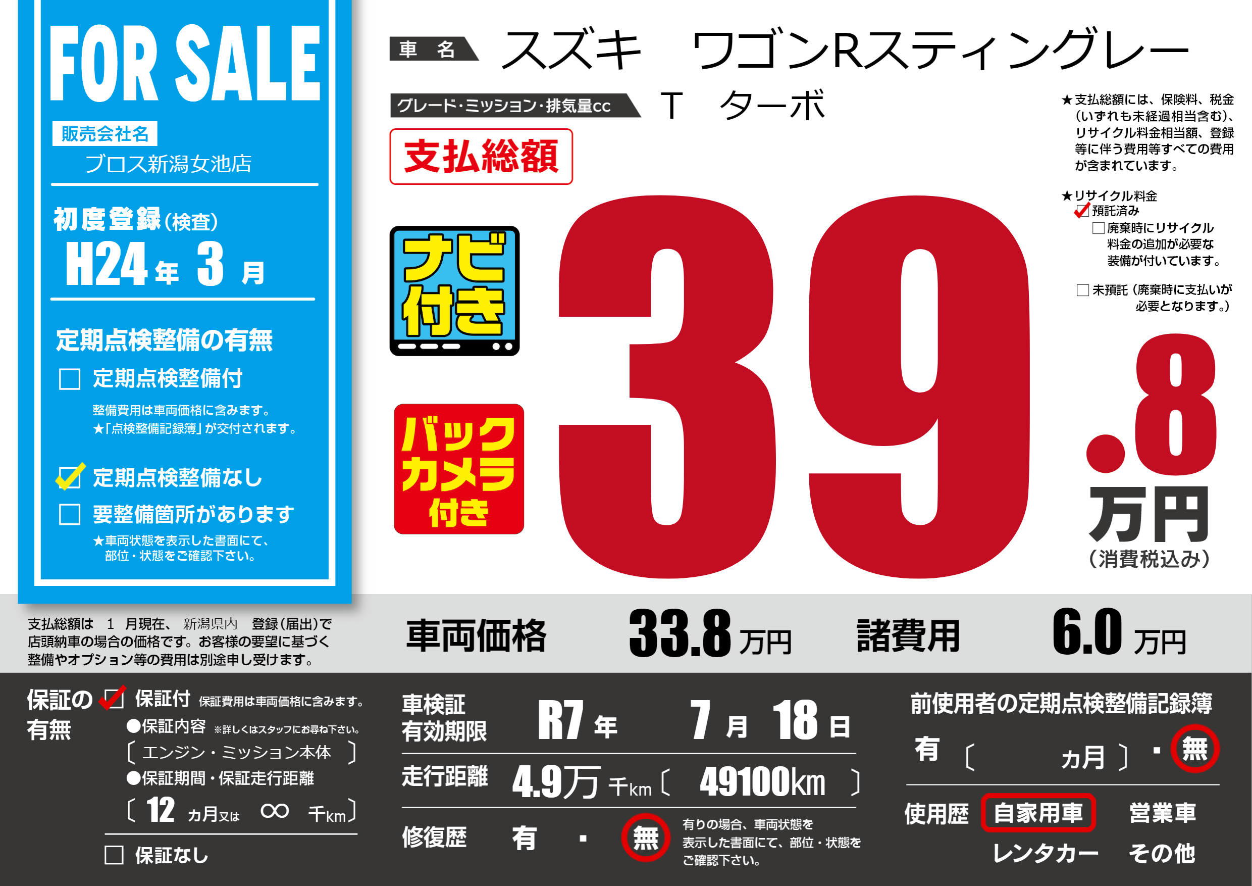 | 車名 | スズキ ワゴンRスティングレー | グレード ミッション 排気量 |