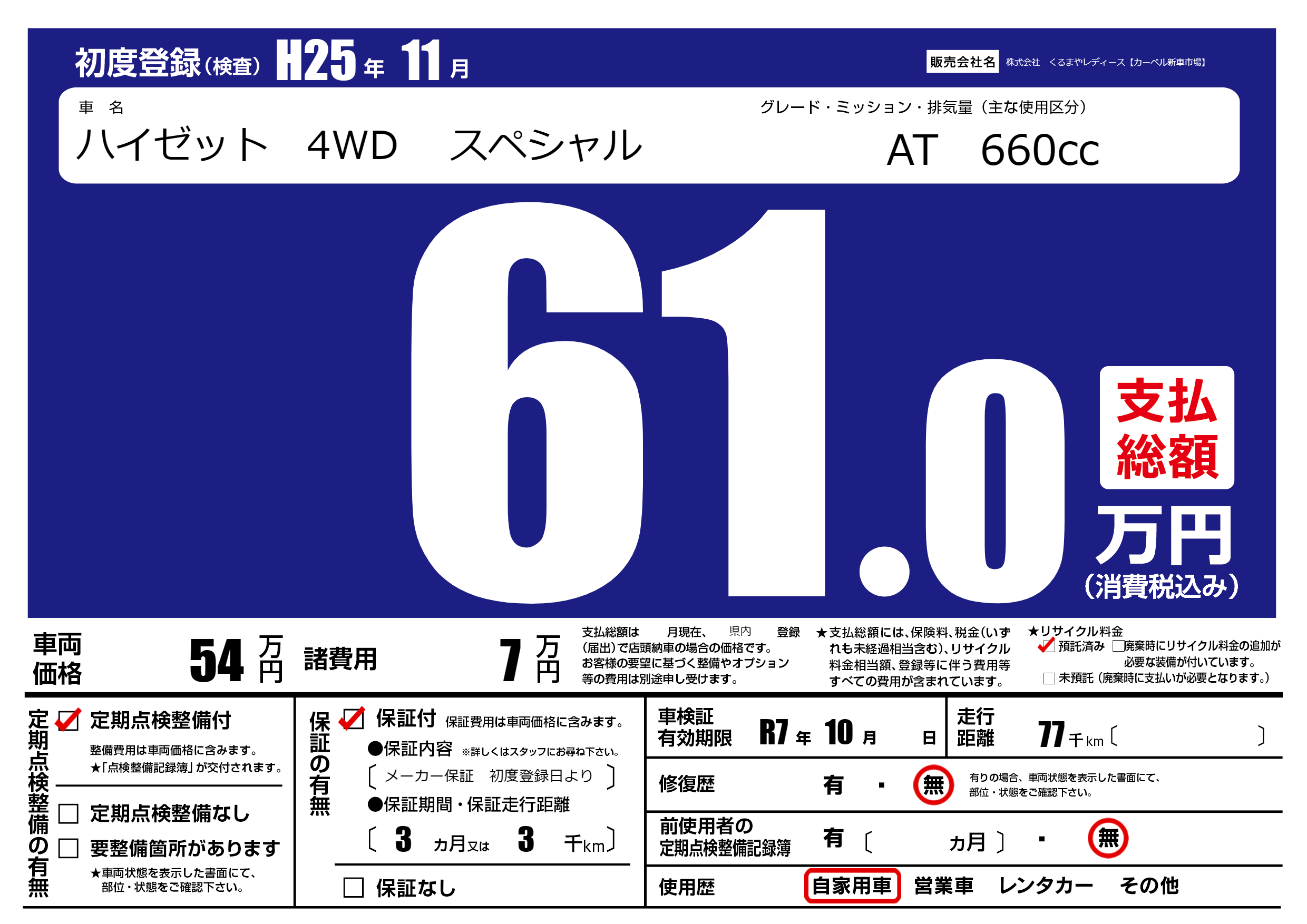 | 走行キロ | 7.7万km | 初年度登録 | H25年11月 |