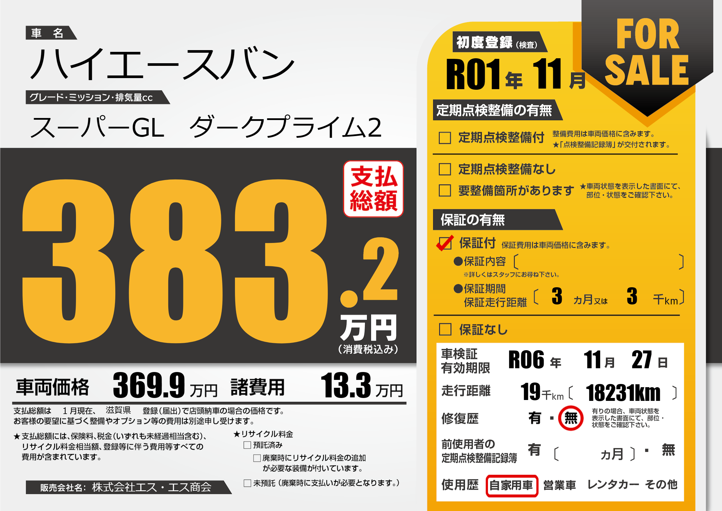 | 車名 | ハイエースバン | グレード ミッション 排気量 |