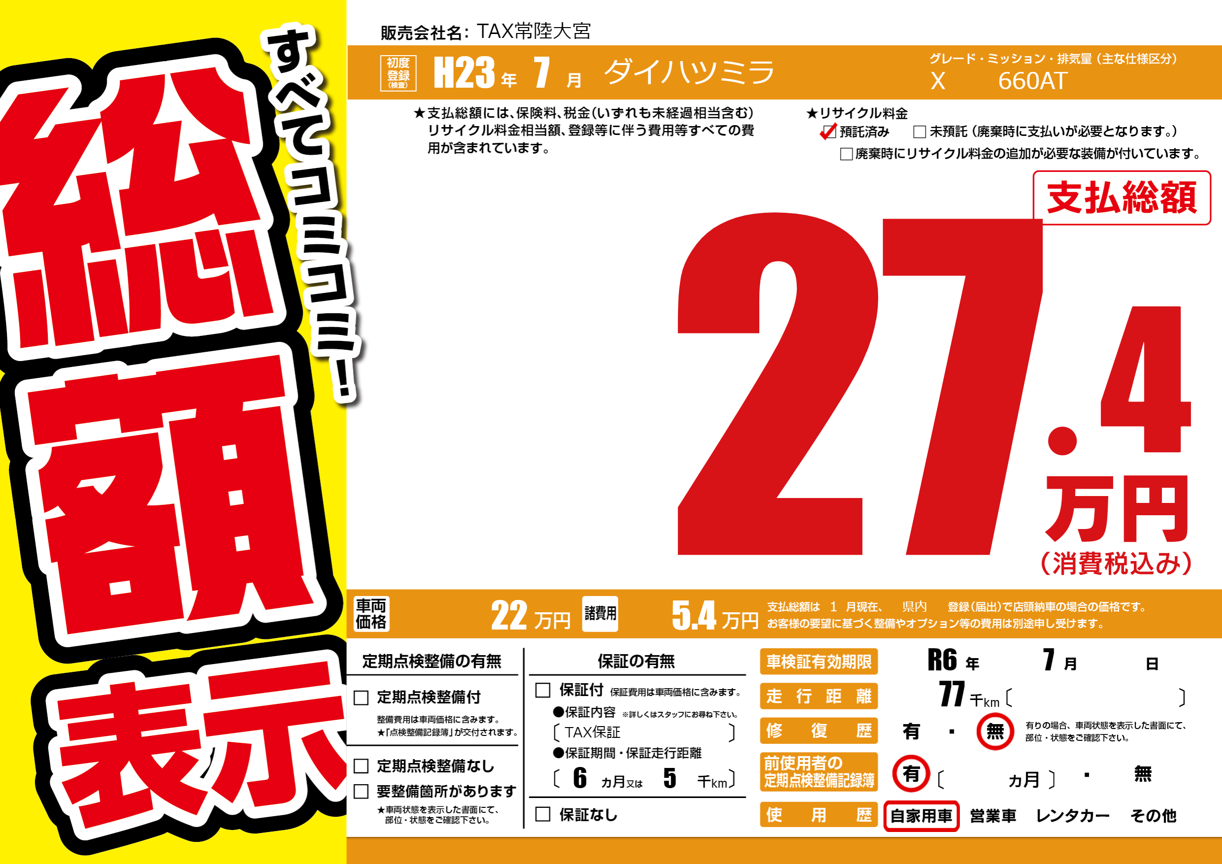 | 走行キロ | 7.7万km | 初年度登録 | H23年7月 |