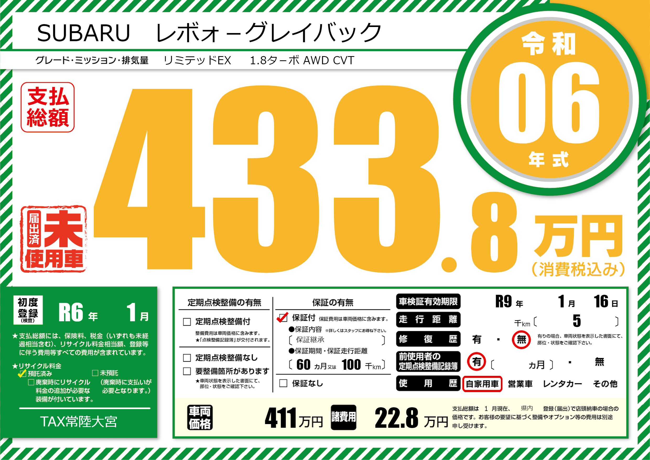 | 車名 | SUBARU レボォ-グレイバック | グレード ミッション 排気量 |
