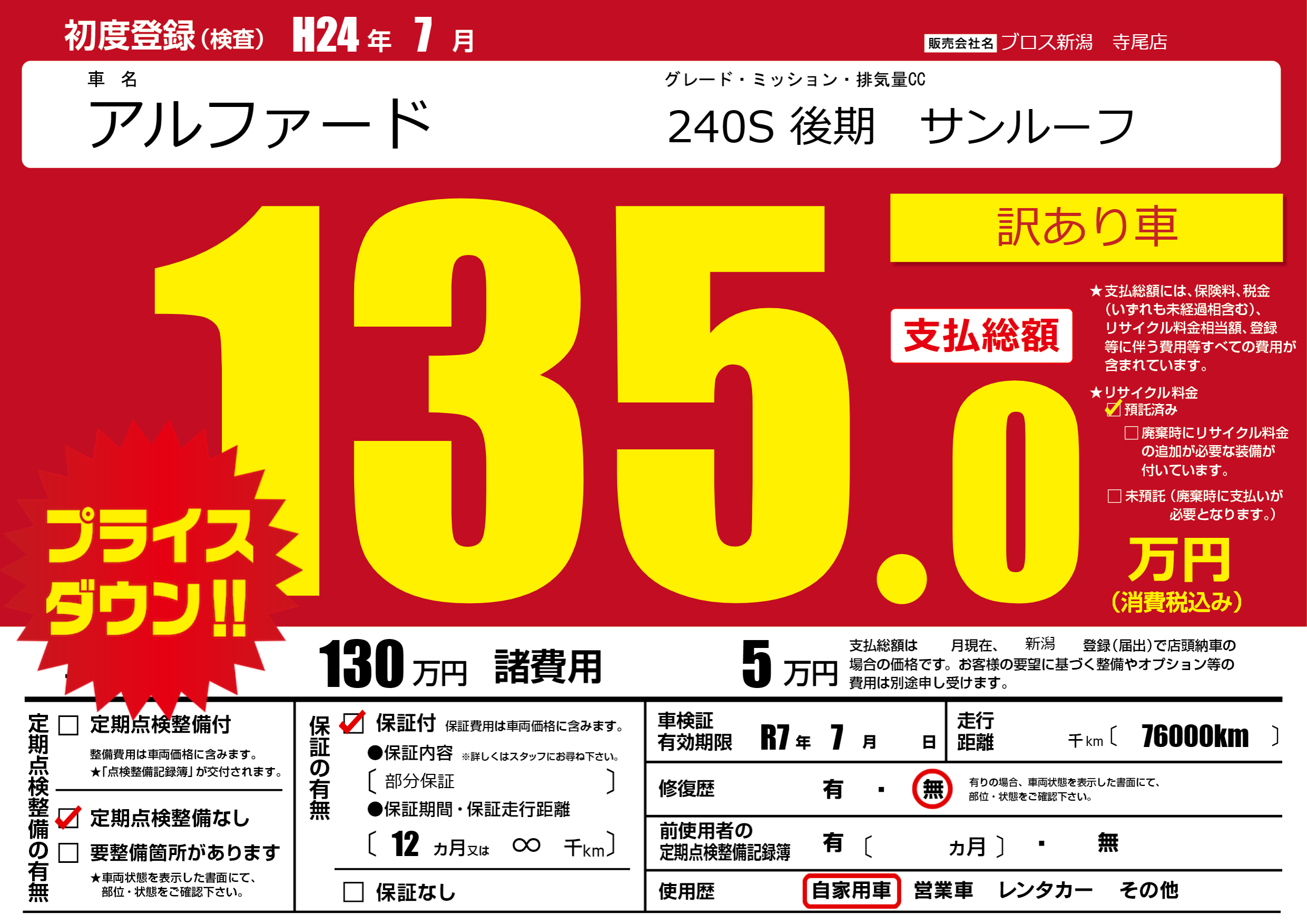 | 走行キロ | - | 初年度登録 | H24年7月 |