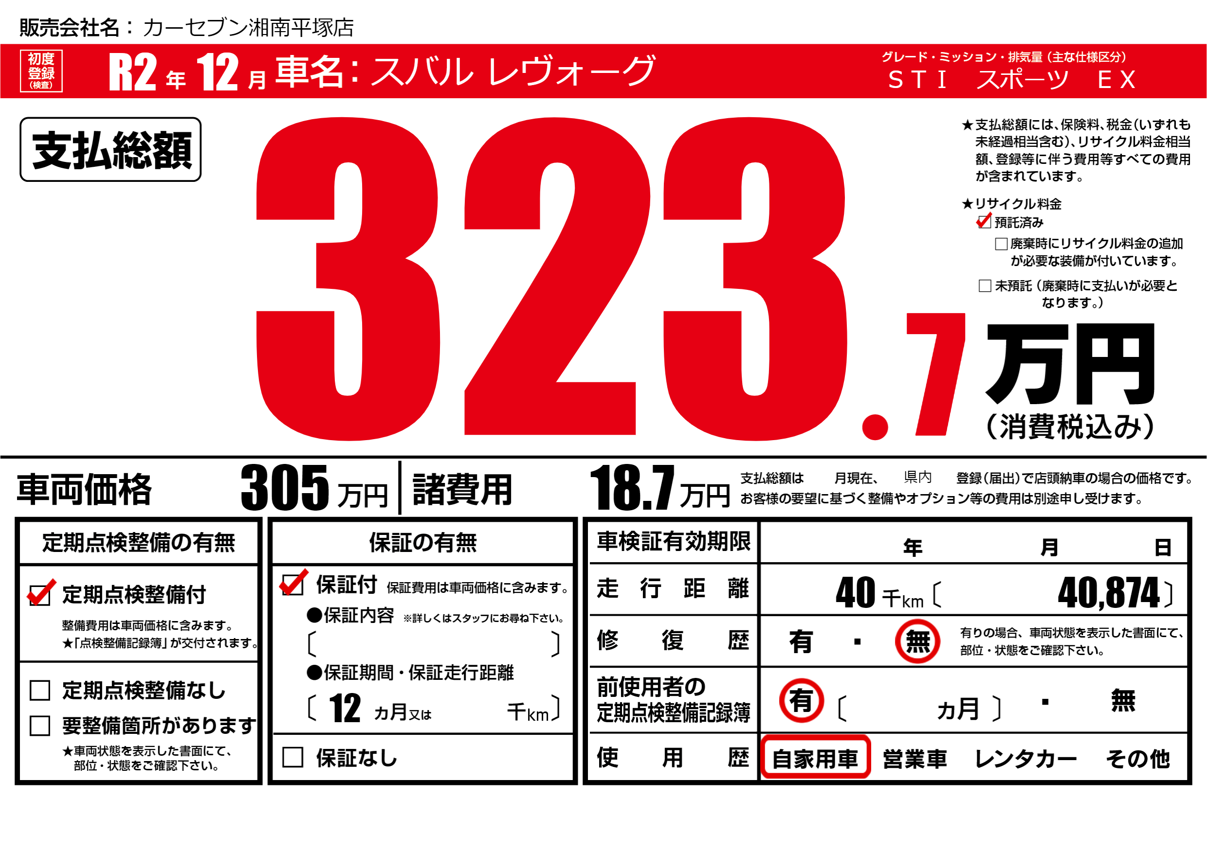 | 車名 | スバル レヴォーグ | グレード ミッション 排気量 |