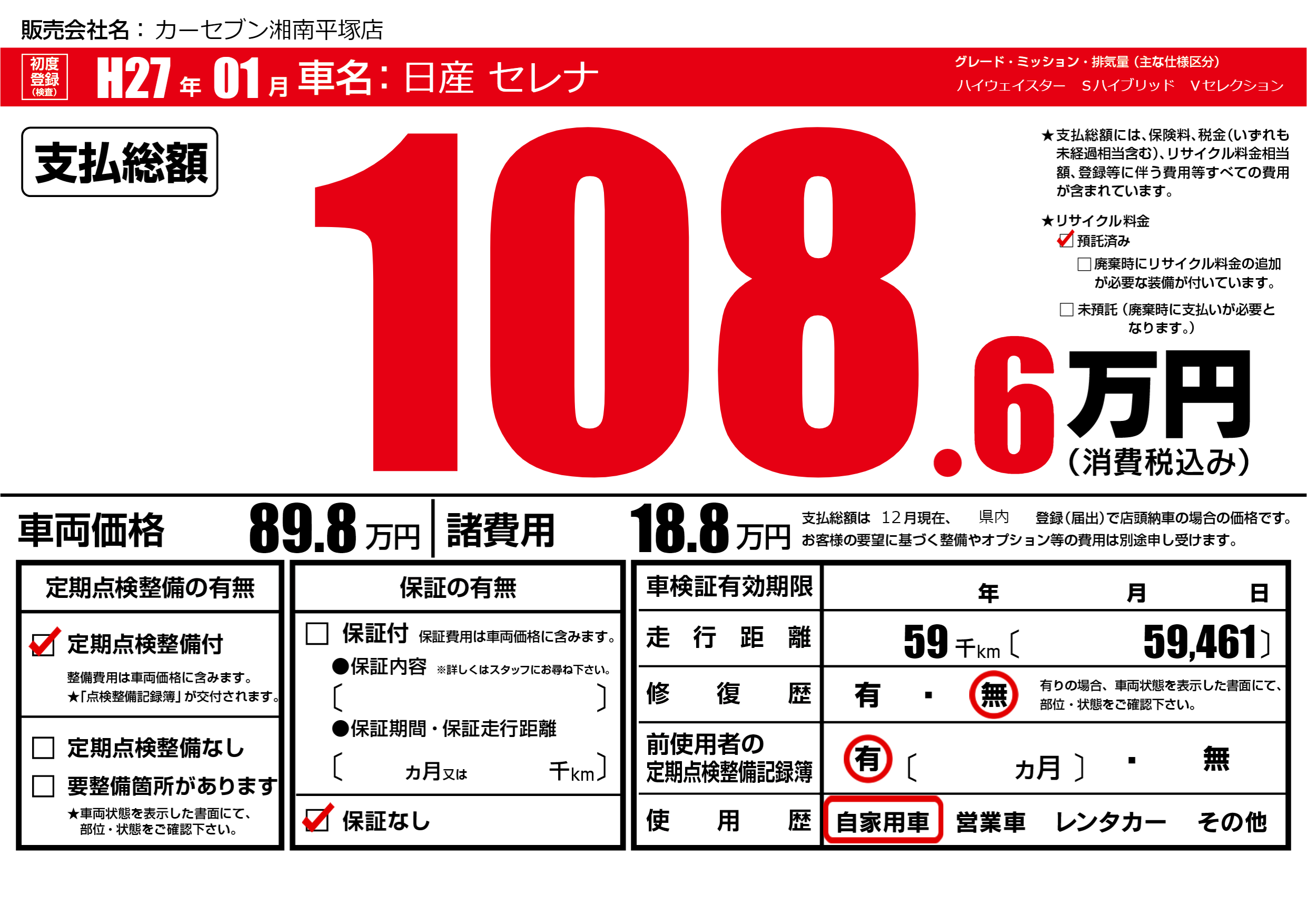 | 車名 | 日産 セレナ | グレード ミッション 排気量 |
