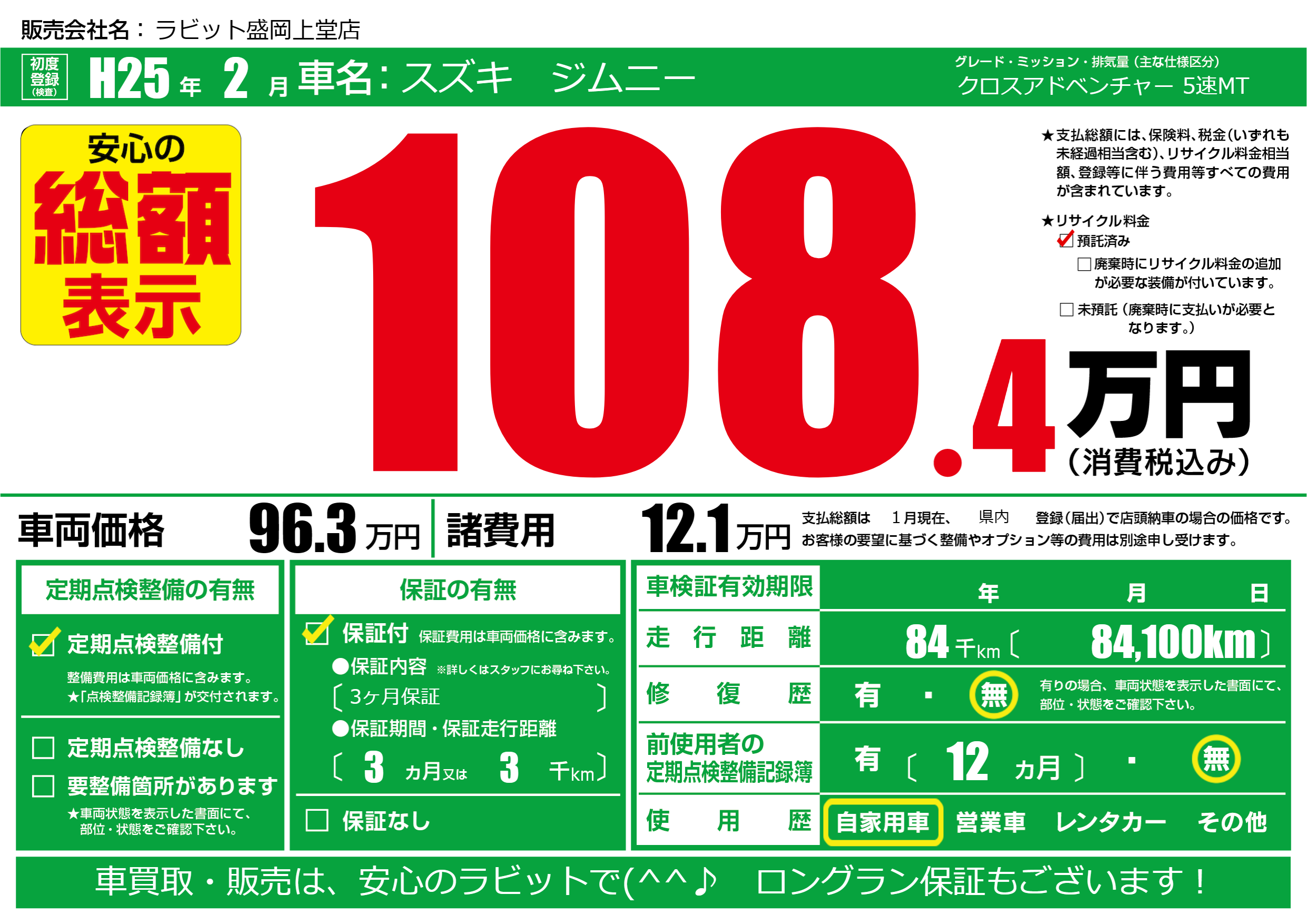| 車名 | スズキ ジムニー | グレード ミッション 排気量 |
