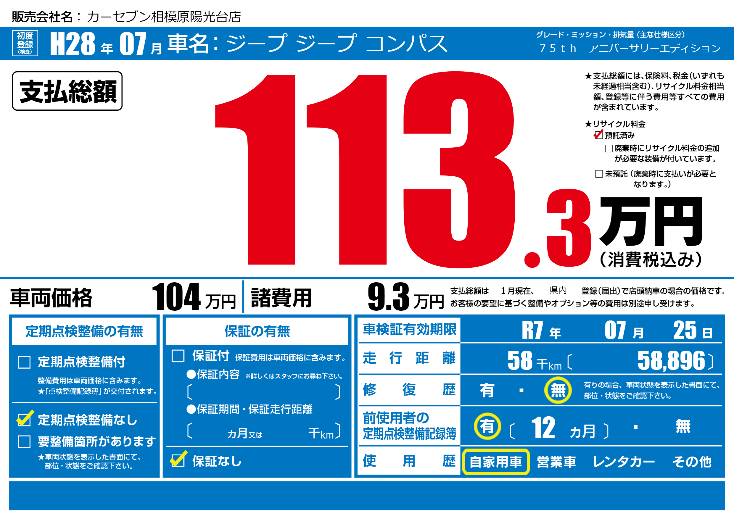 | 車名 | ジープ ジープ コンパス | グレード ミッション 排気量 |