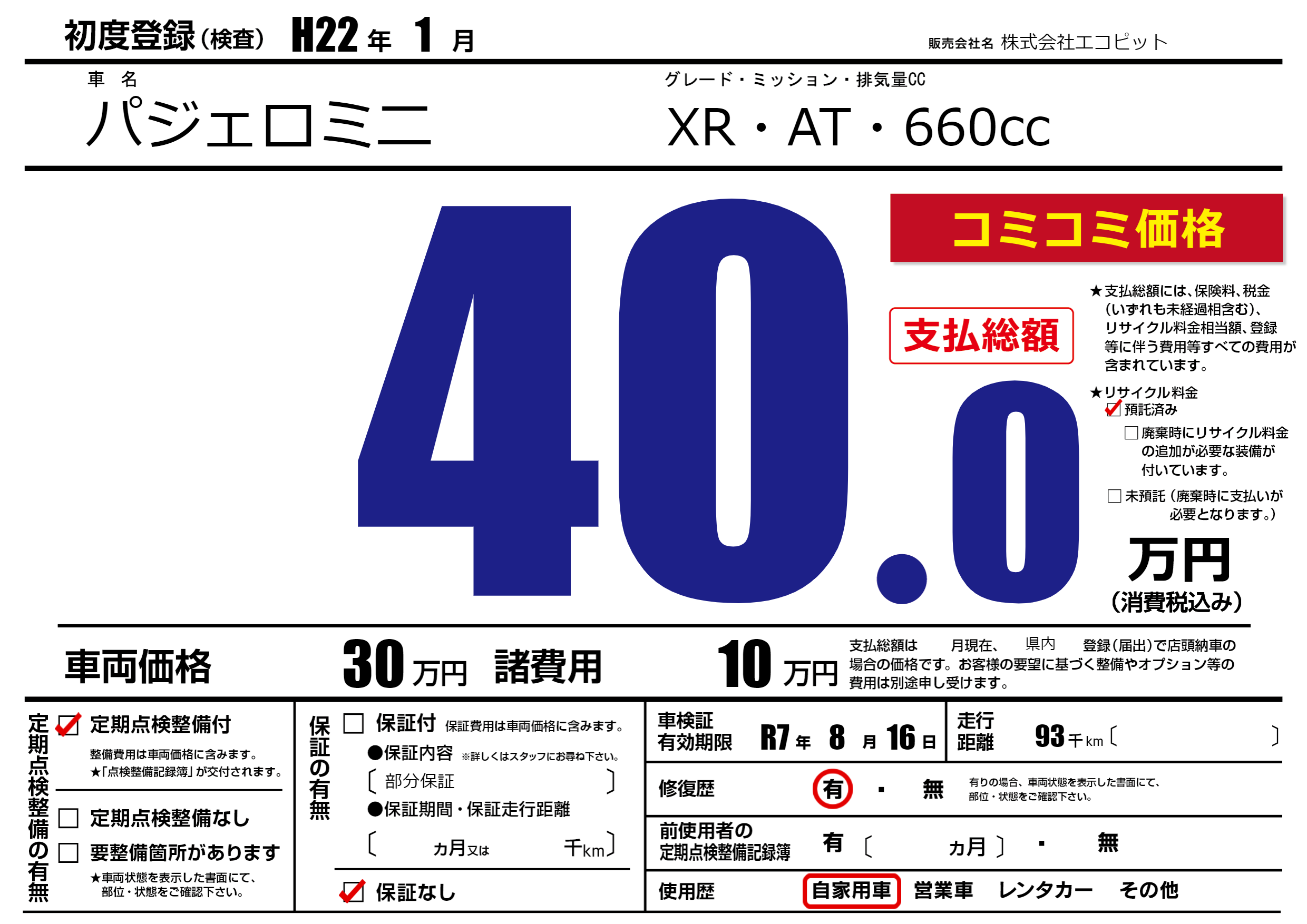 | 車名 | パジェロミニ | グレード ミッション 排気量 |