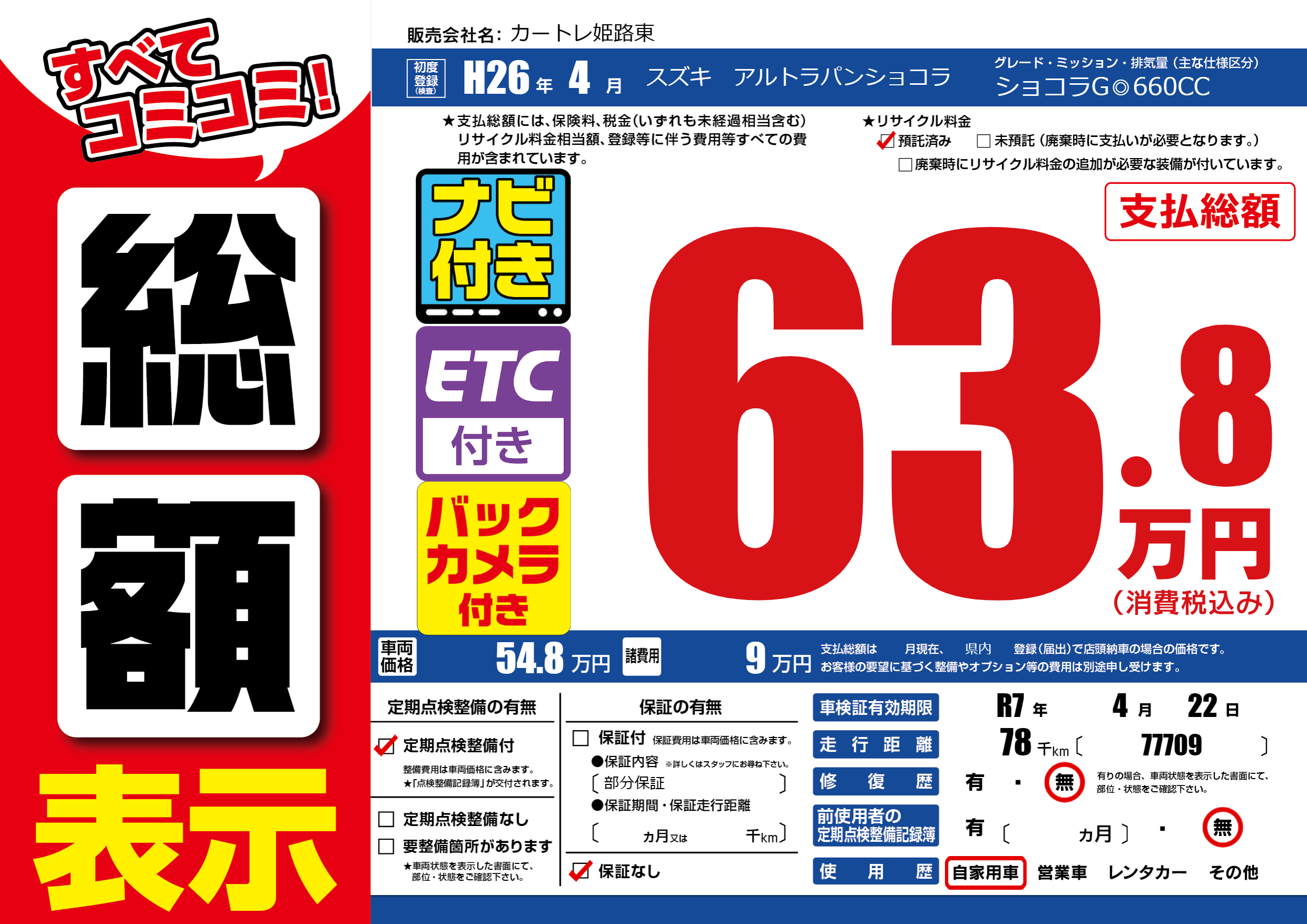 | 走行キロ | 7.8万km | 初年度登録 | H26年4月 |