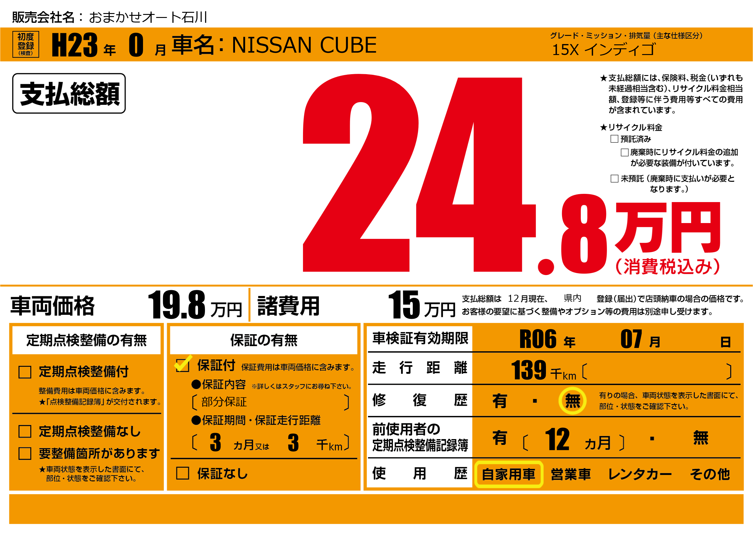 | 車名 | NISSAN CUBE | グレード ミッション 排気量 |