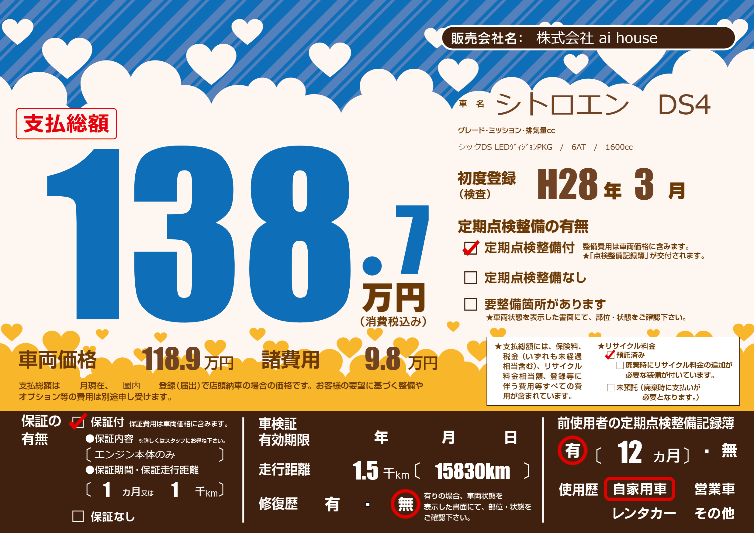 | 車名 | シトロエン DS4 | グレード ミッション 排気量 |