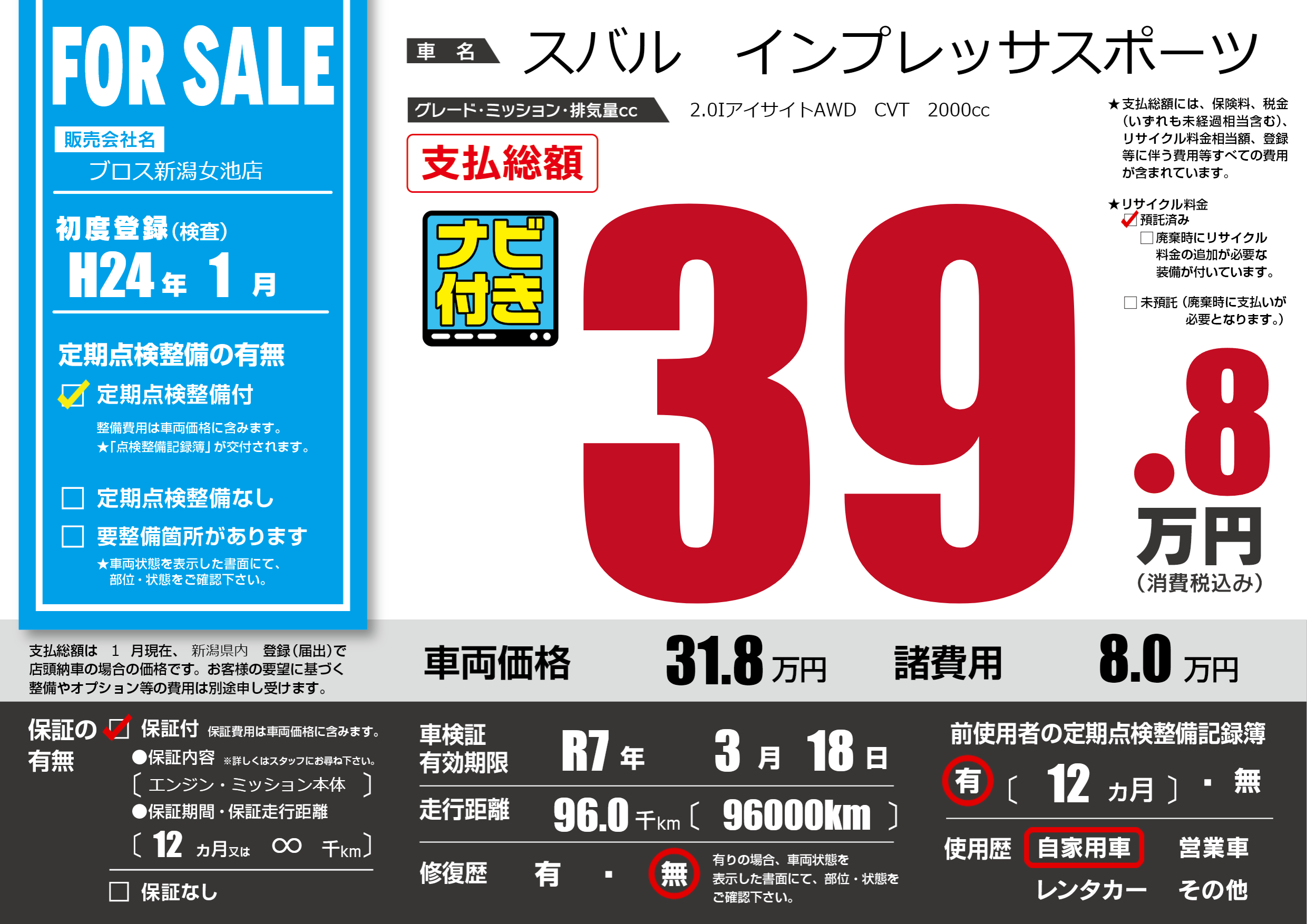 | 車名 | スバル インプレッサスポーツ | グレード ミッション 排気量 |