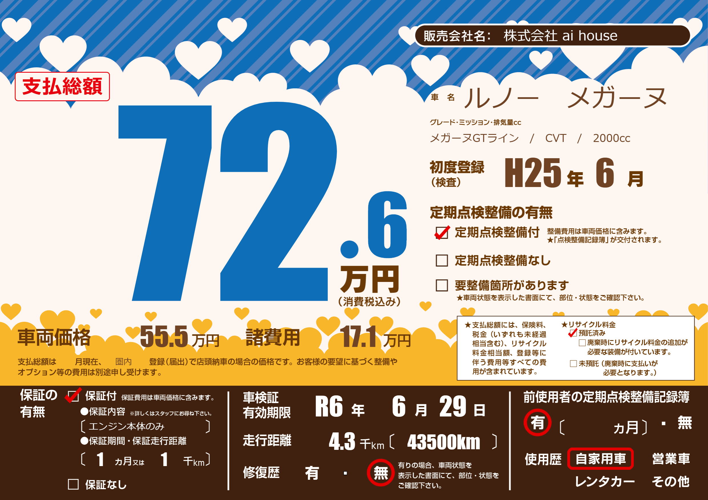 | 走行キロ | 0.4万km | 初年度登録 | H25年6月 |