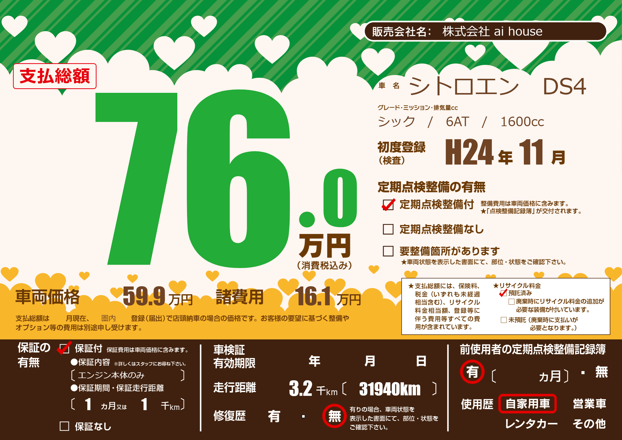 | 車名 | シトロエン DS4 | グレード ミッション 排気量 |