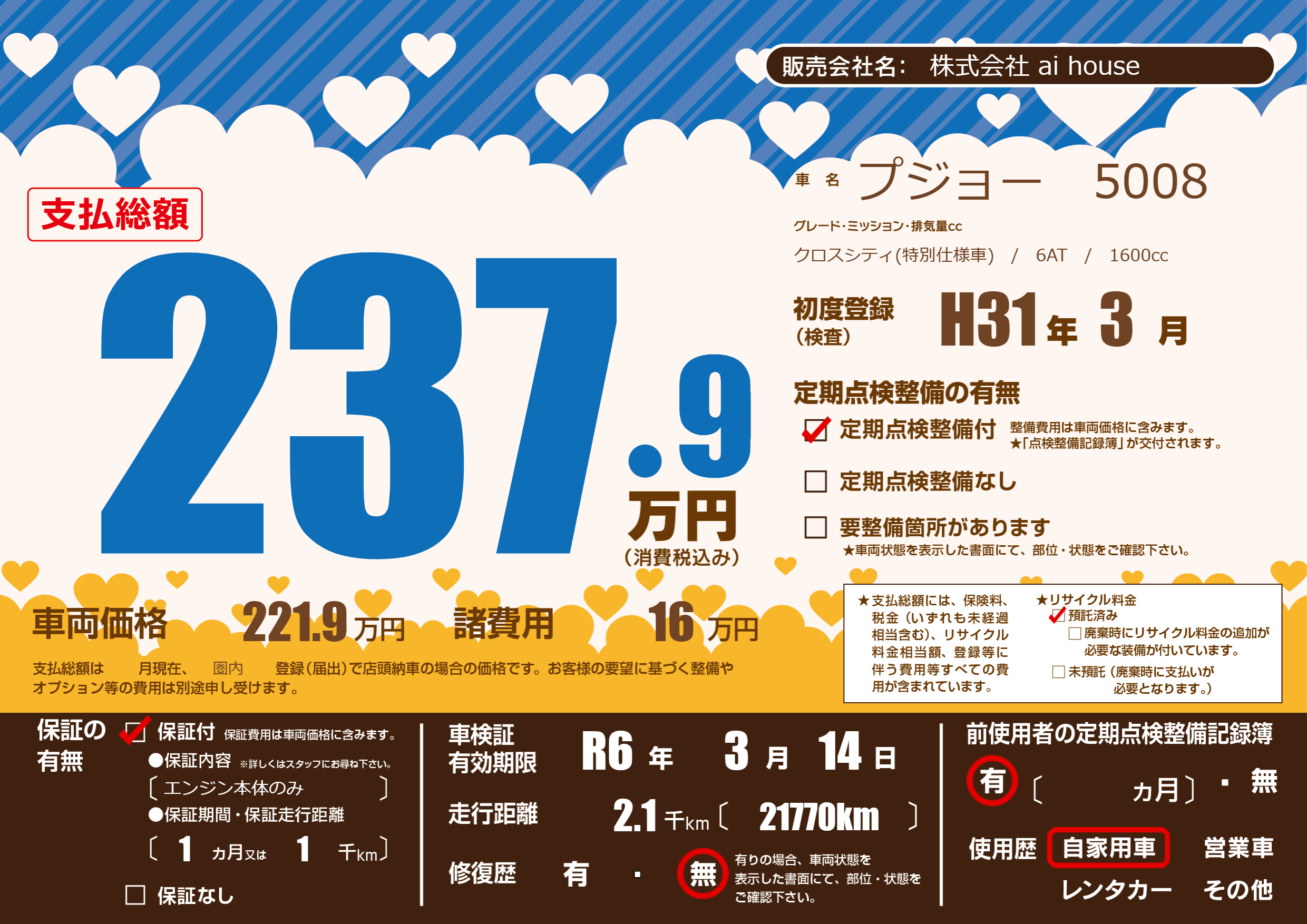 | 車名 | プジョー 5008 | グレード ミッション 排気量 |