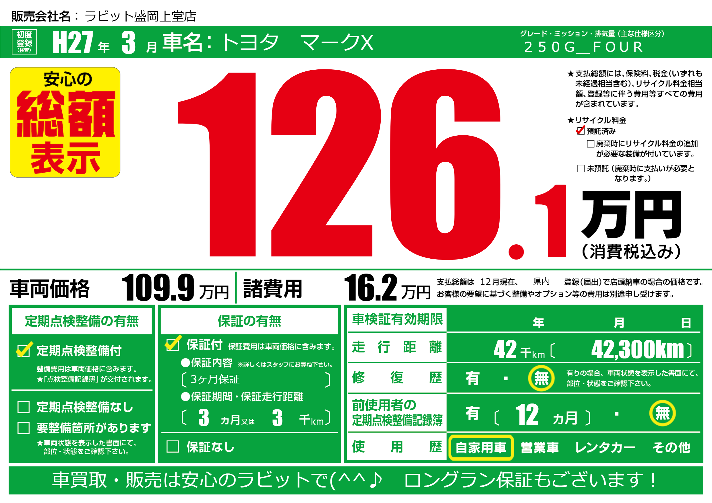 | 走行キロ | 4.2万km | 初年度登録 | H27年3月 |