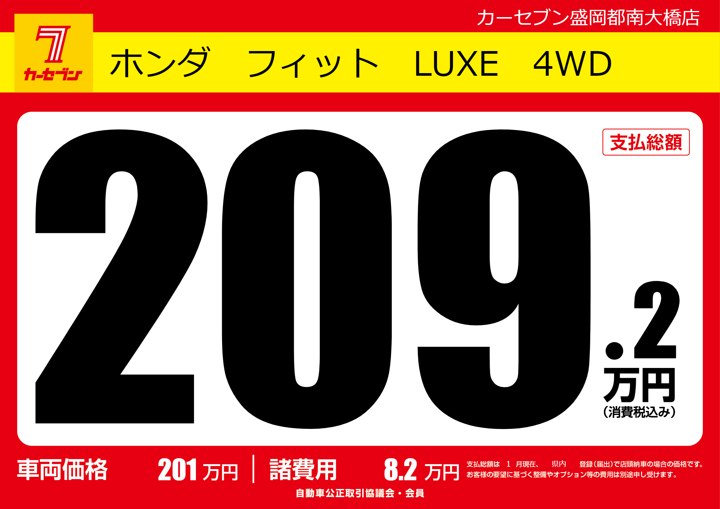 | 車名 | ホンダ フィット LUXE 4WD | グレード ミッション 排気量 |
