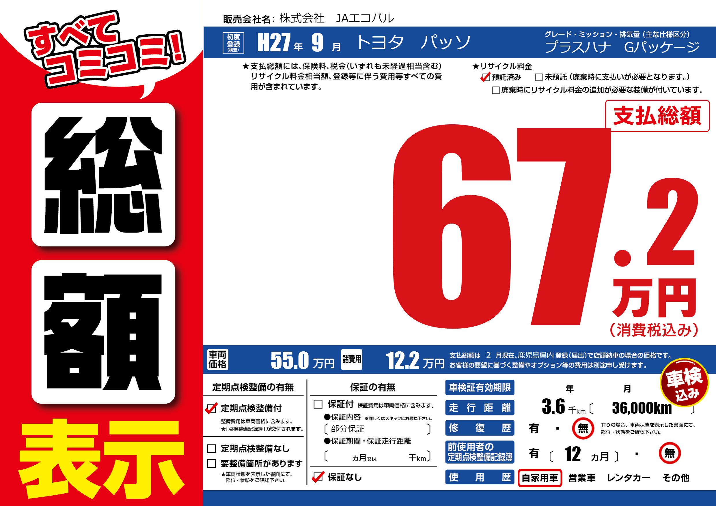 | 車名 | トヨタ パッソ | グレード ミッション 排気量 |
