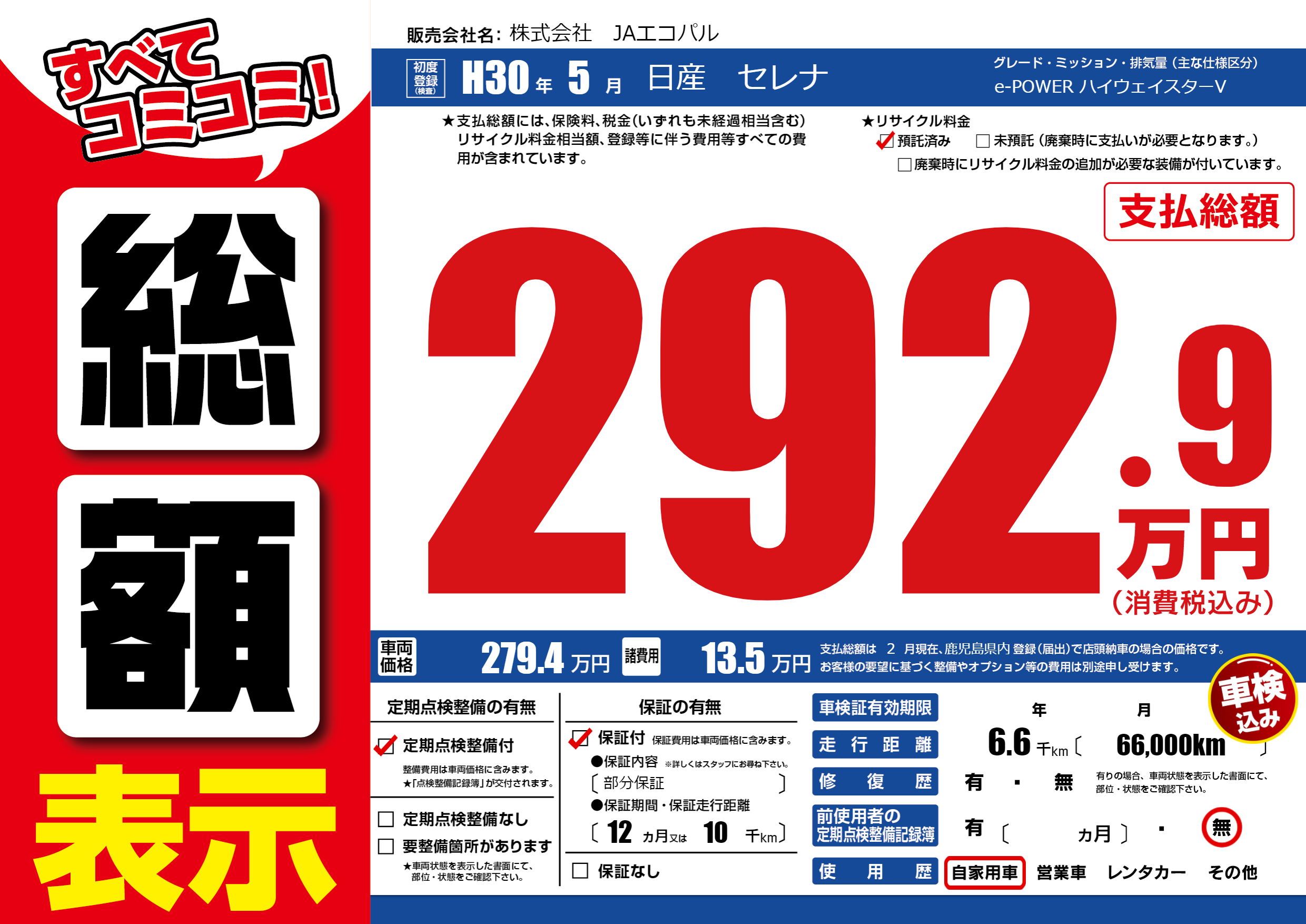 | 車名 | 日産 セレナ | グレード ミッション 排気量 |