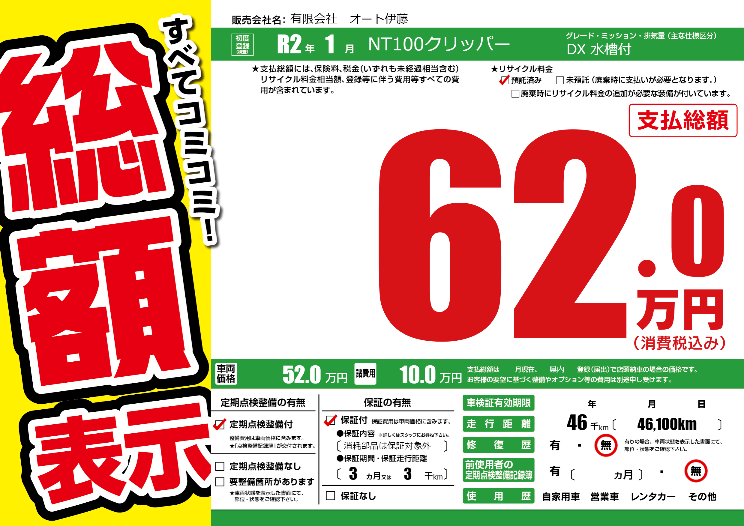 | 車名 | NT100クリッパー | グレード ミッション 排気量 |