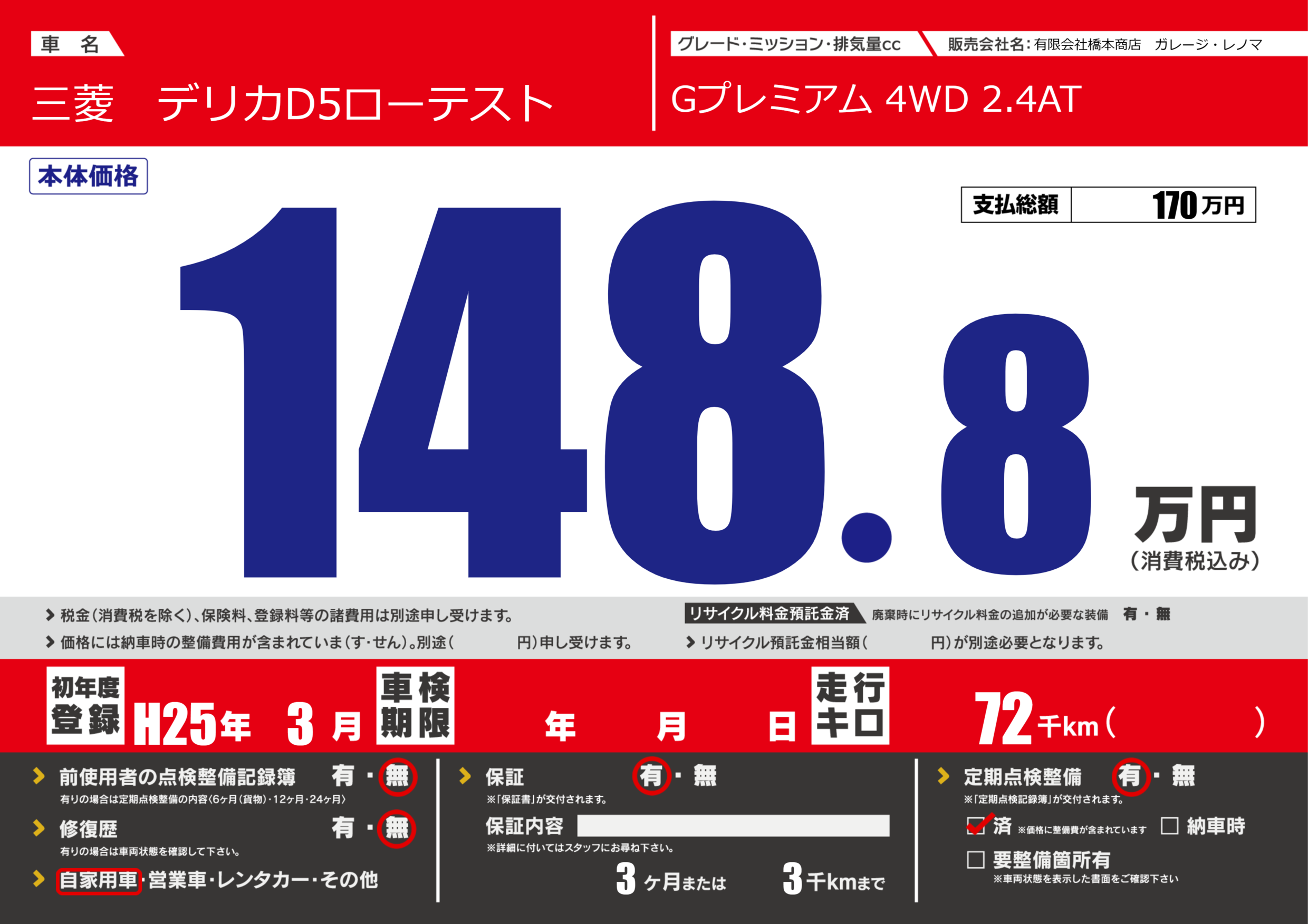| 定期点検整備 | 定期点検整備あり 定期点検整備済み | ||