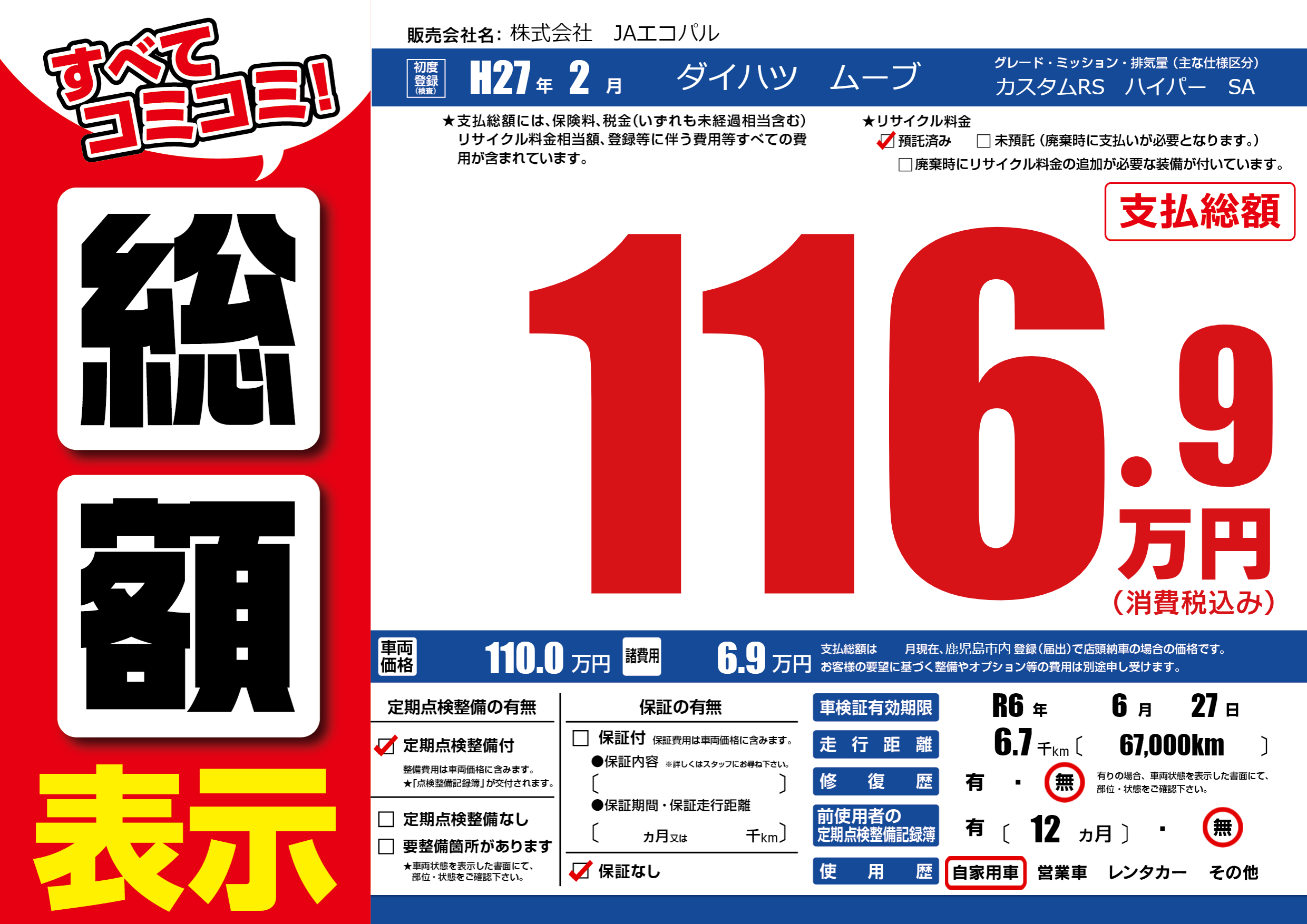 | 走行キロ | 0.6万km | 初年度登録 | H27年2月 |