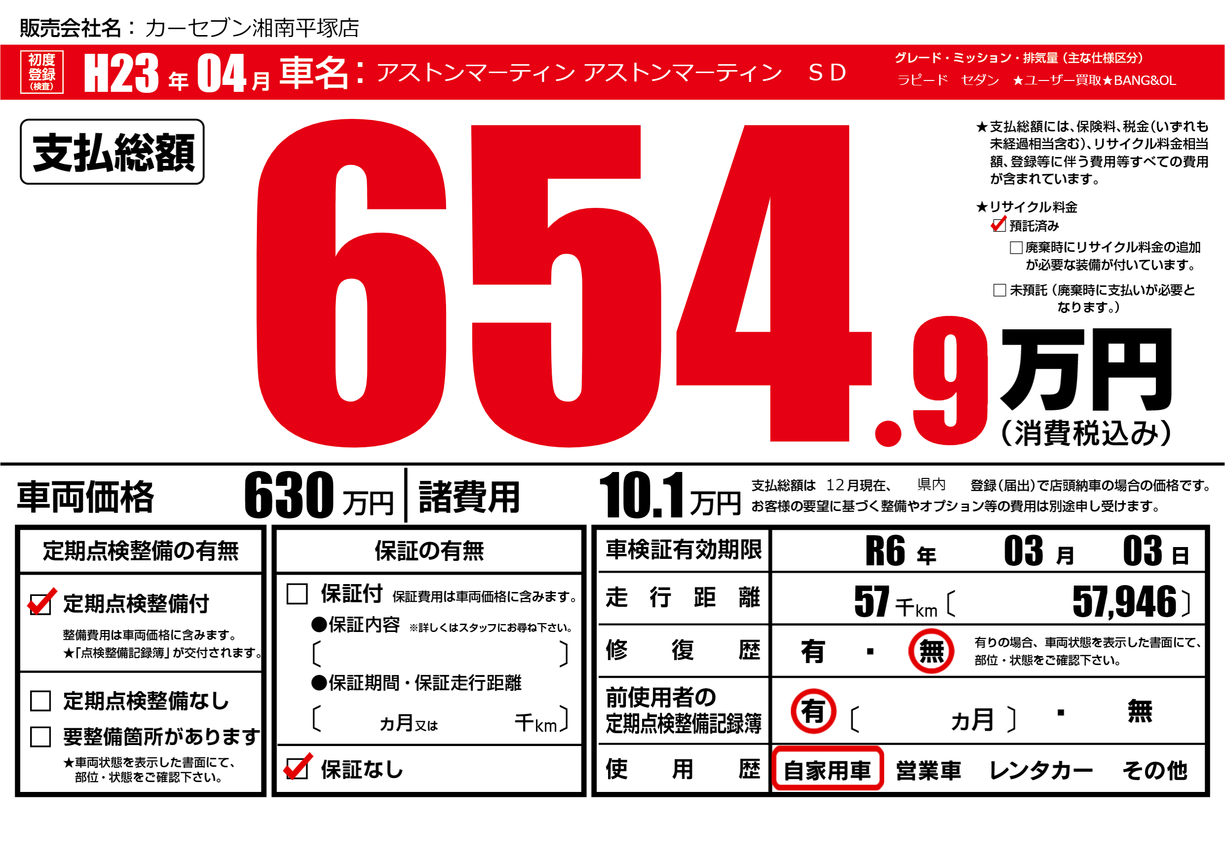 | 車名 | アストンマーティン アストンマーティン SD | グレード ミッション 排気量 |