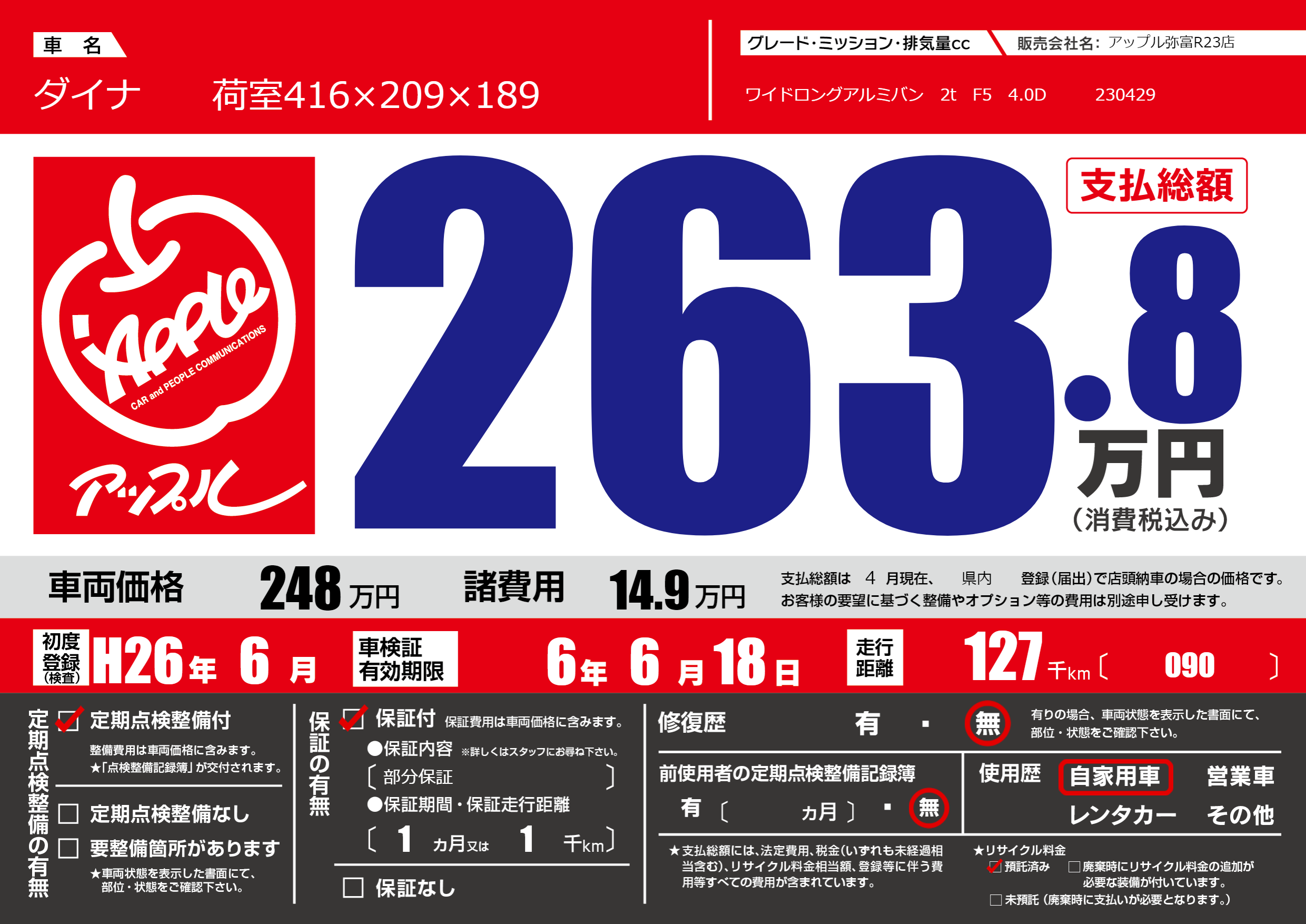 | 車名 | ダイナ 荷室416×209×189 | グレード ミッション 排気量 |