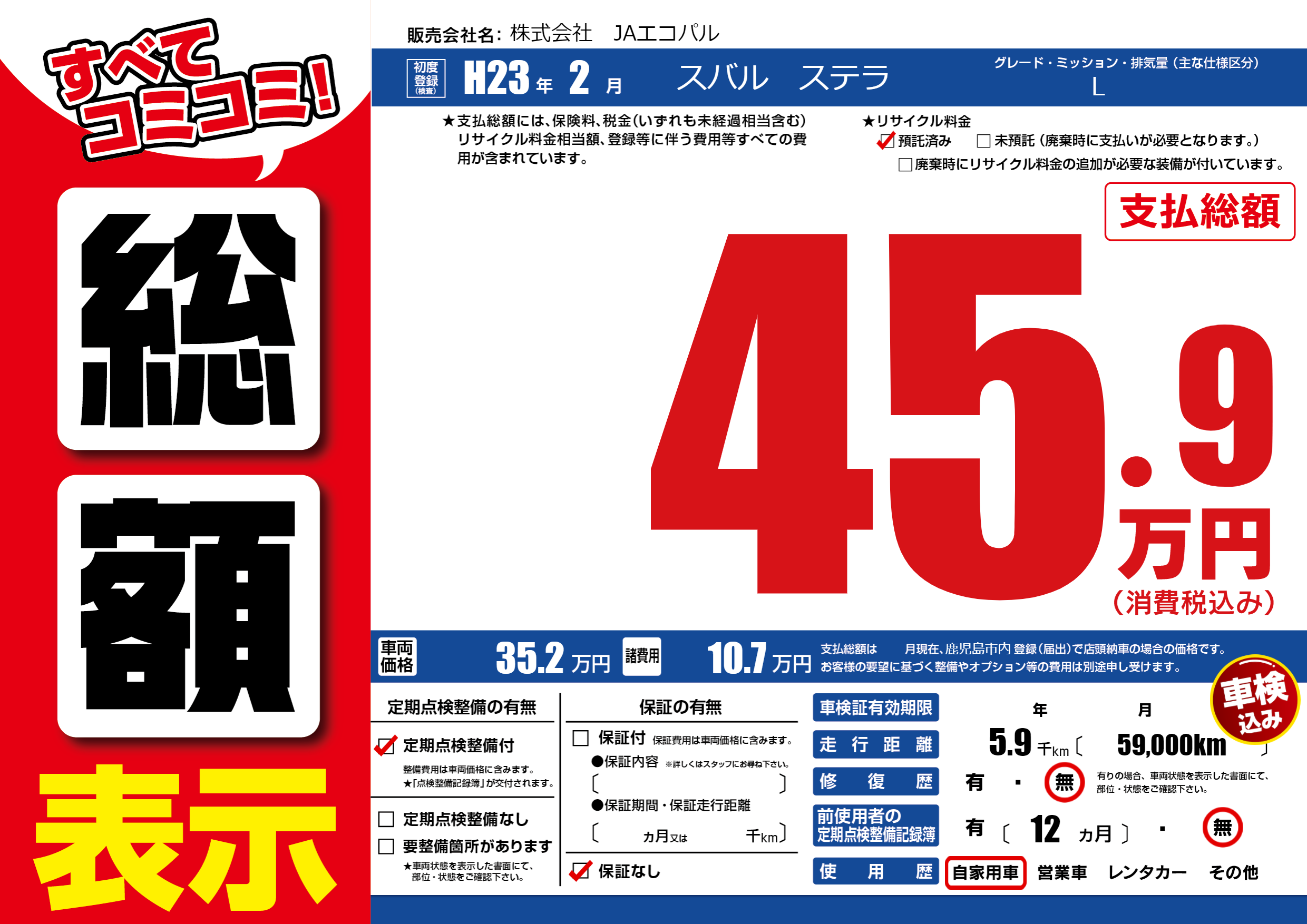 | 車名 | スバル ステラ | グレード ミッション 排気量 |