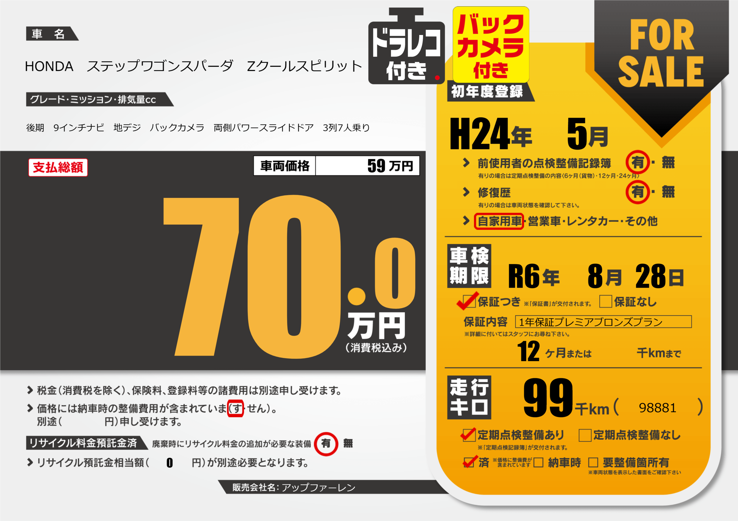 | 車名 | HONDA ステップワゴンスパーダ Zクールスピリット | グレード ミッション 排気量 |