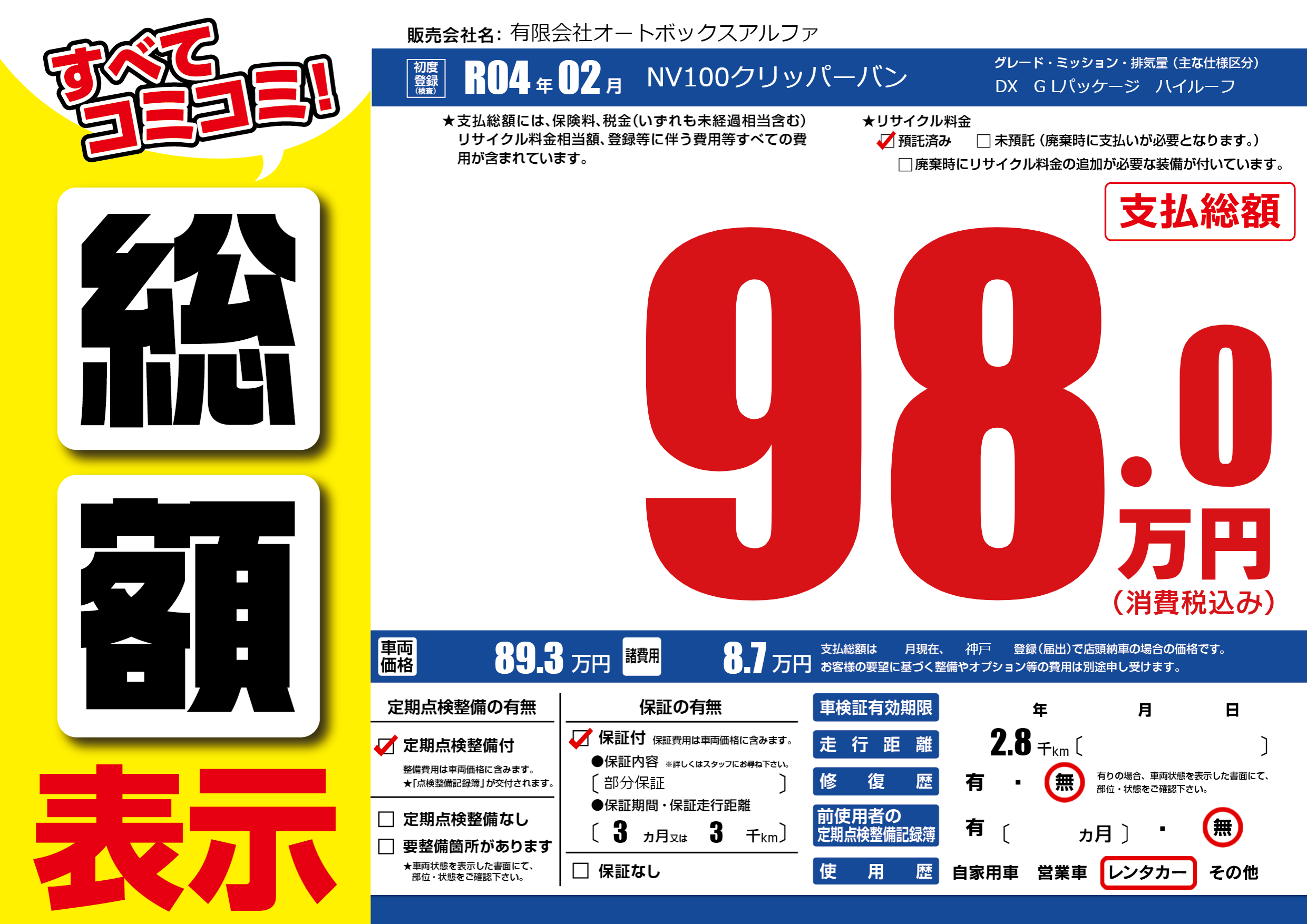 保証付き 保証内容(部分保証) 3ヶ月または(3)千kmまで |
