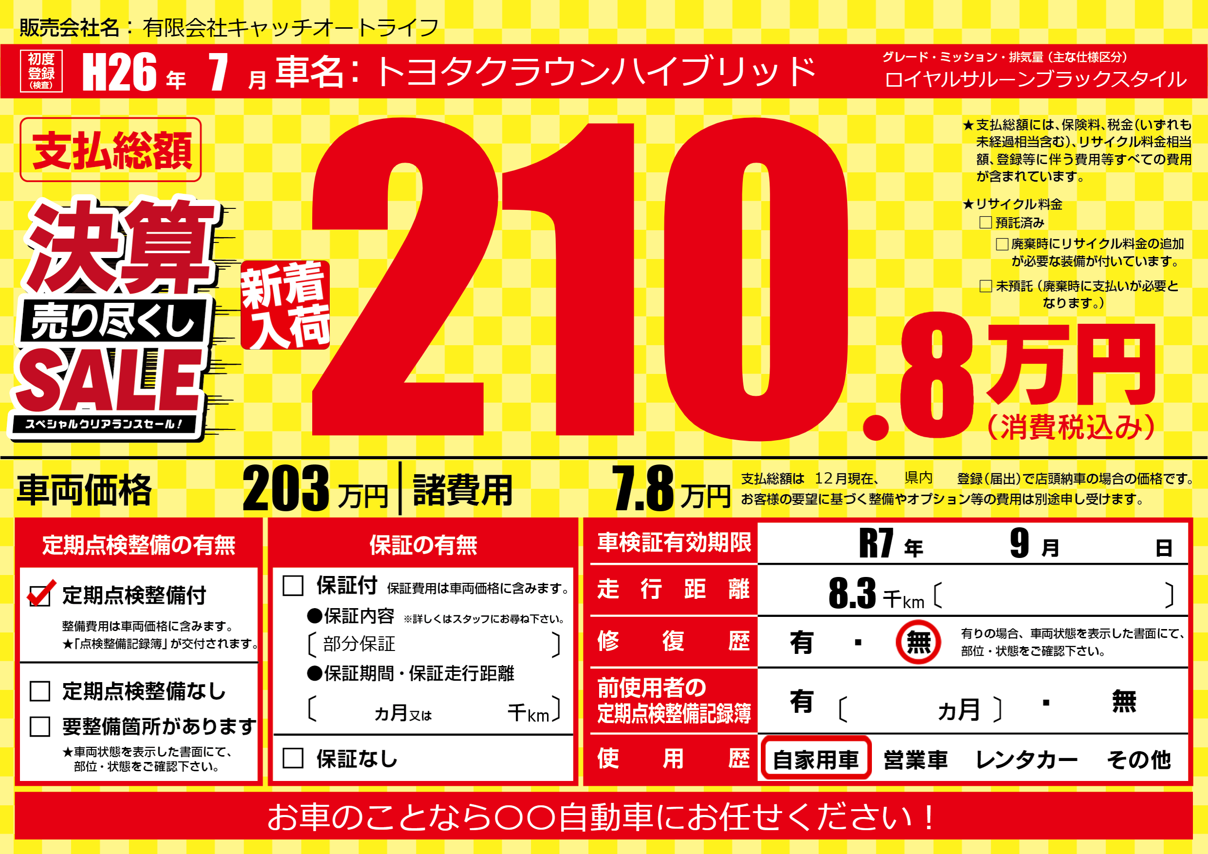 | 車名 | トヨタクラウンハイブリッド | グレード ミッション 排気量 |