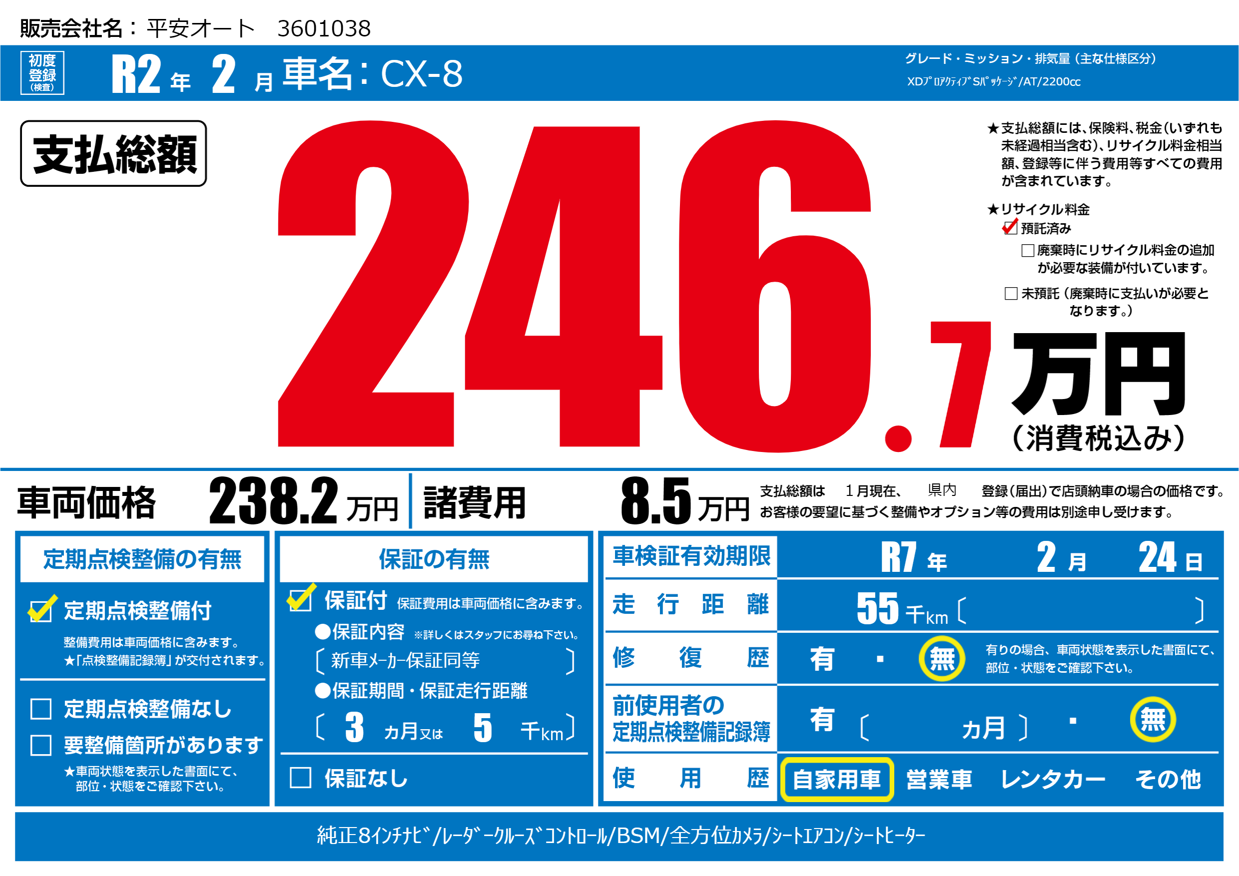 | 車名 | CX-8 | グレード ミッション 排気量 |