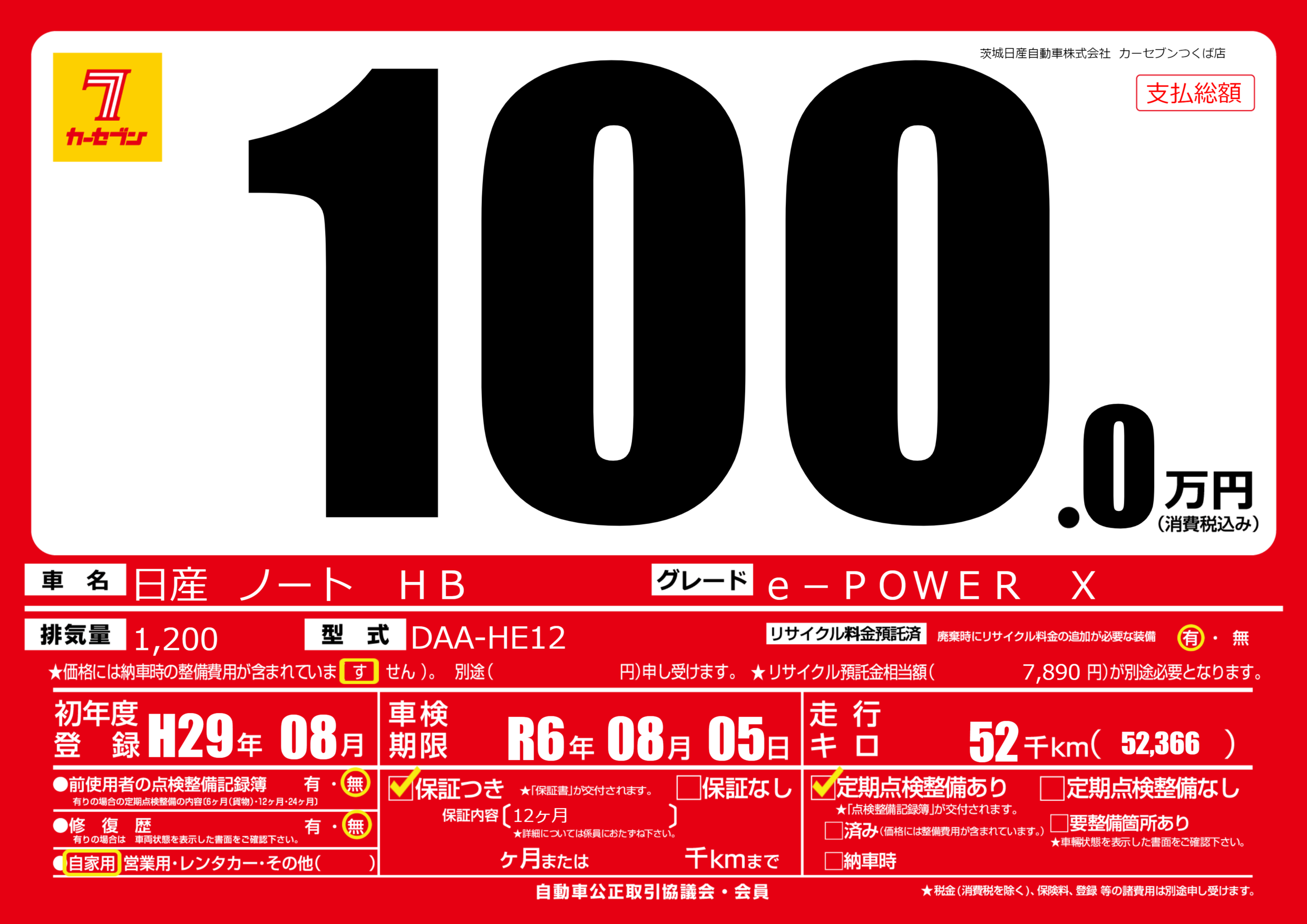 | 車名 | 日産 ノート HB | グレード ミッション 排気量 |