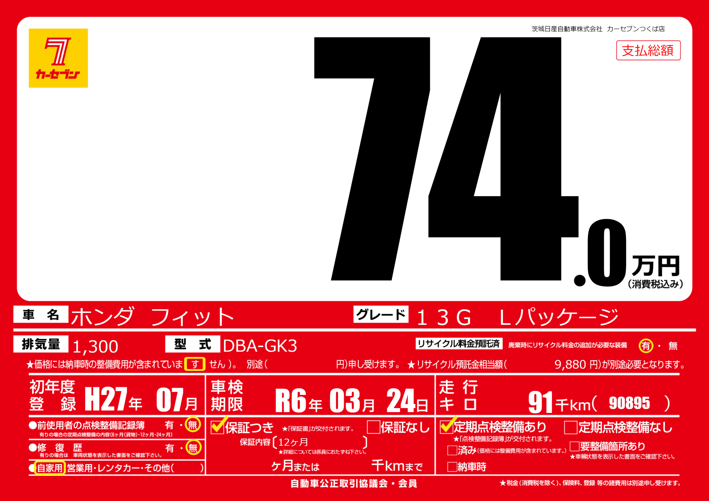 保証付き 保証内容(12ヶ月) ---ヶ月または()千kmまで |
