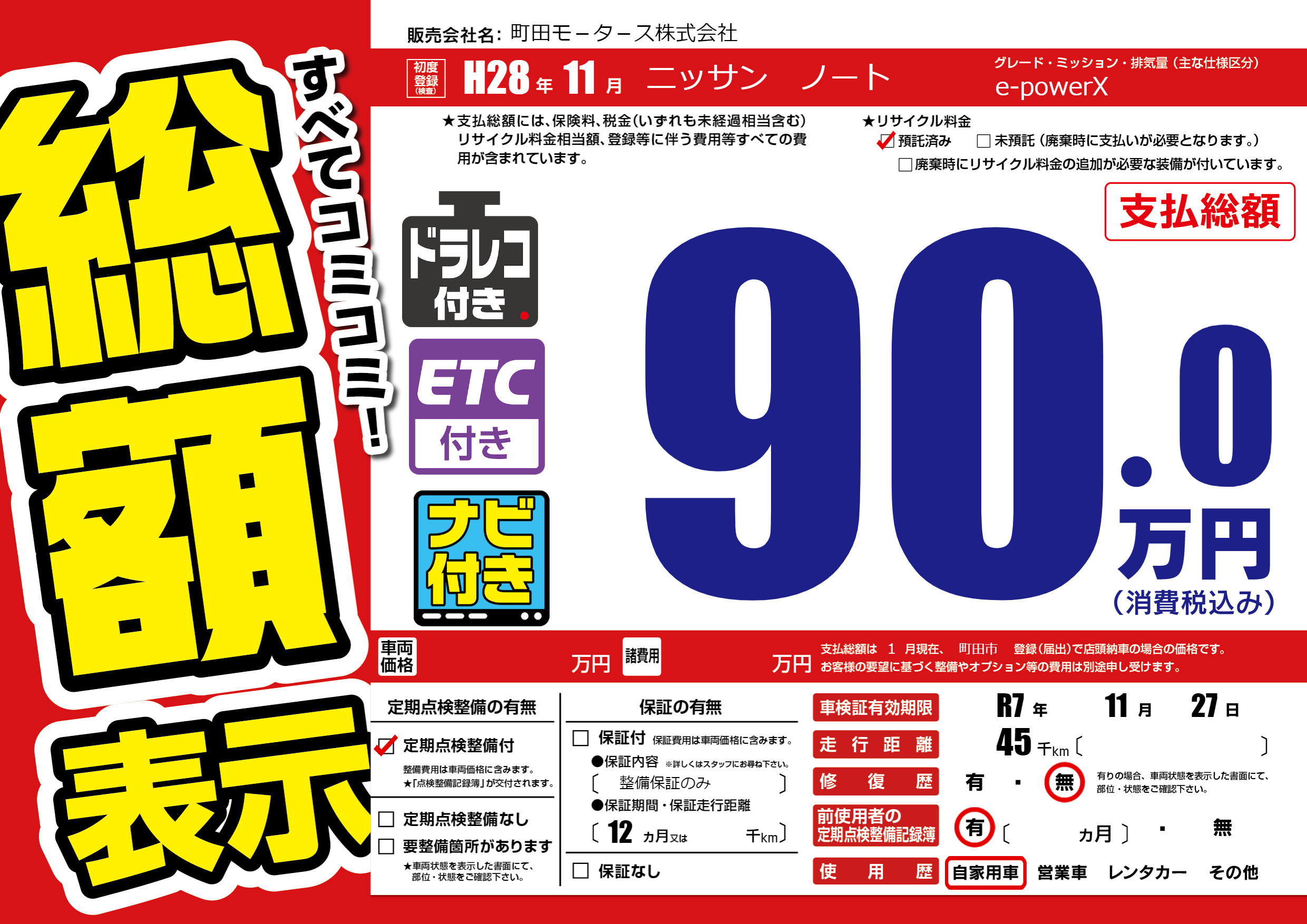 | 車名 | ニッサン ノート | グレード ミッション 排気量 |