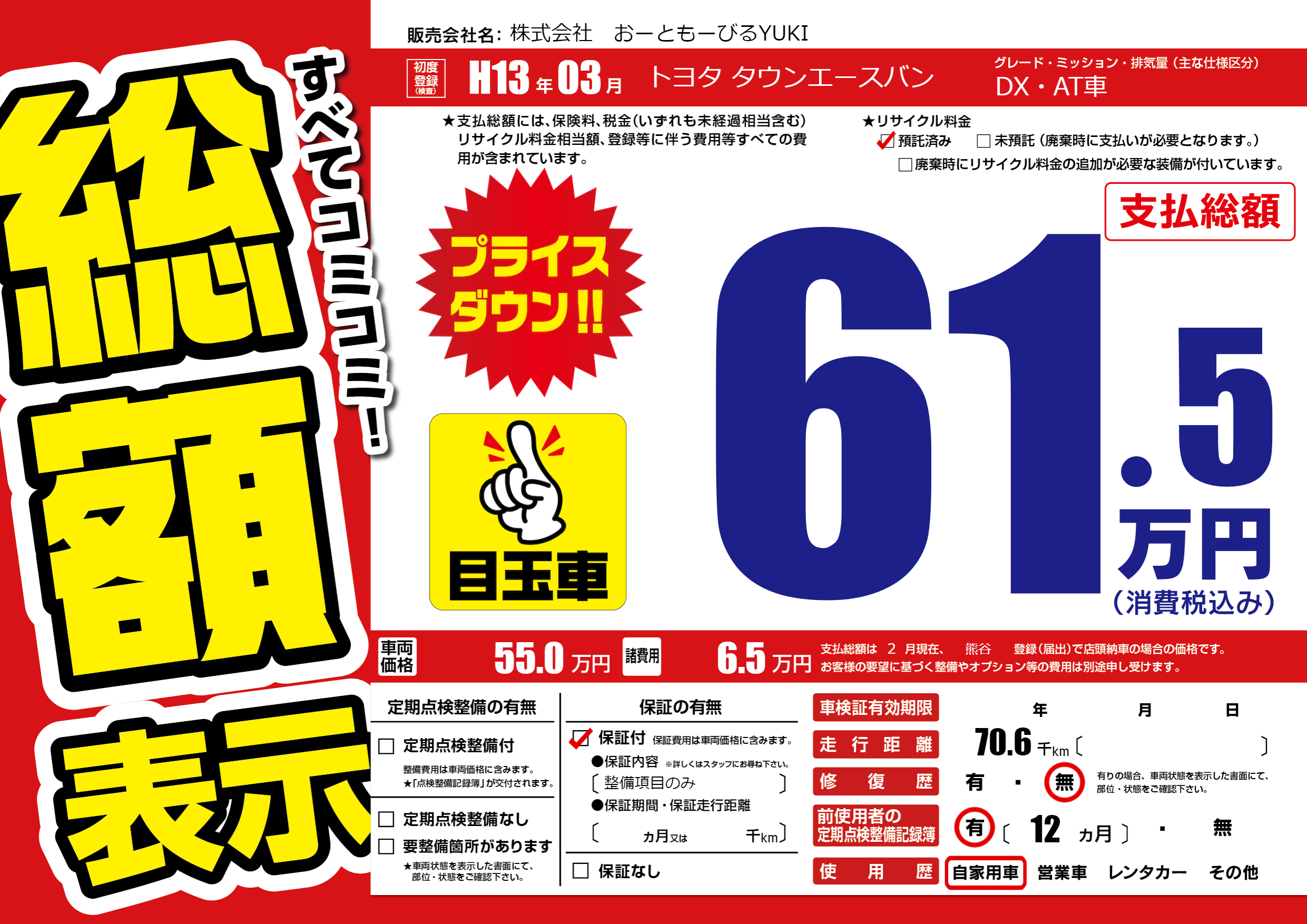 | 車名 | トヨタ タウンエースバン | グレード ミッション 排気量 |