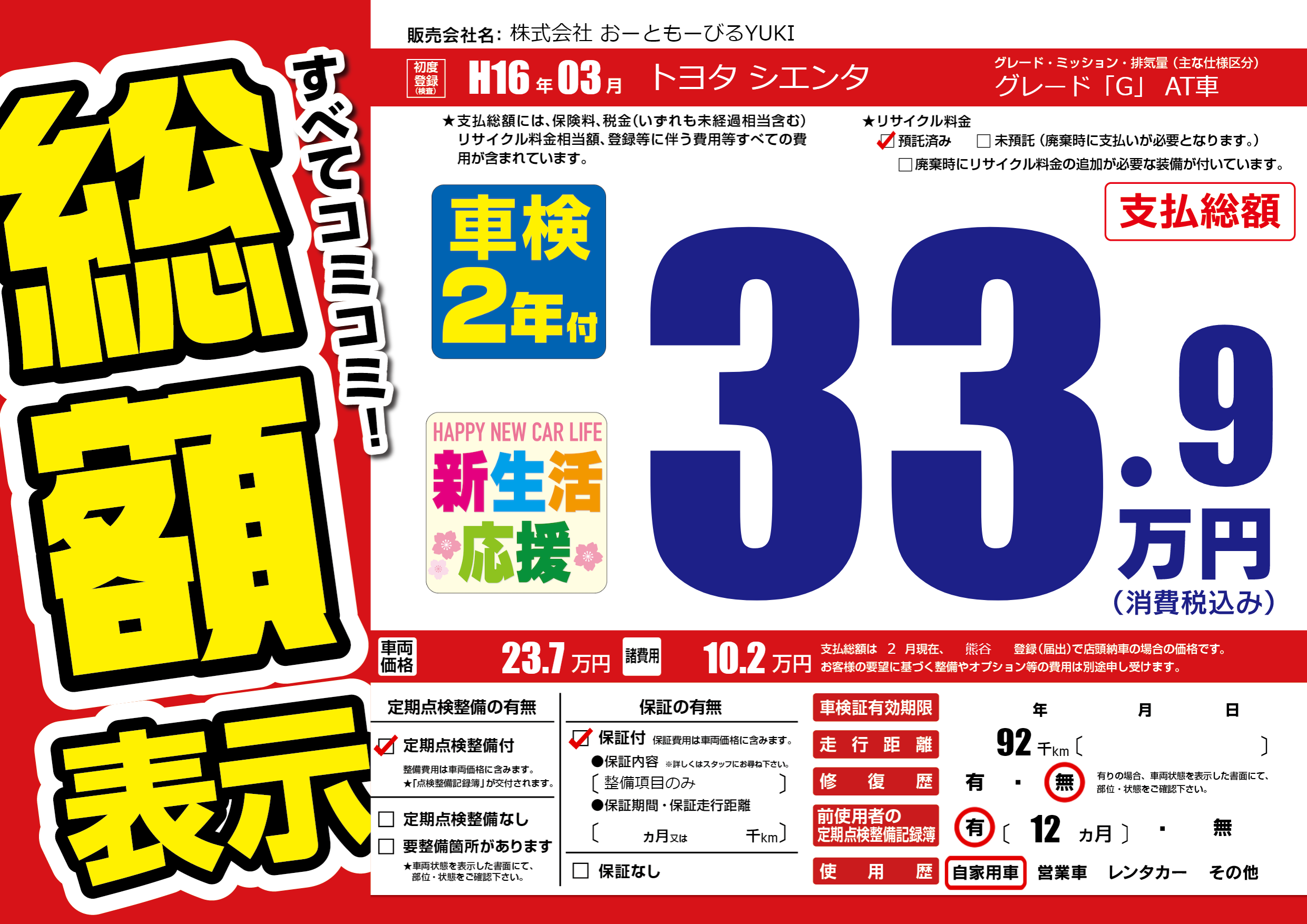 | 車名 | トヨタ シエンタ | グレード ミッション 排気量 |
