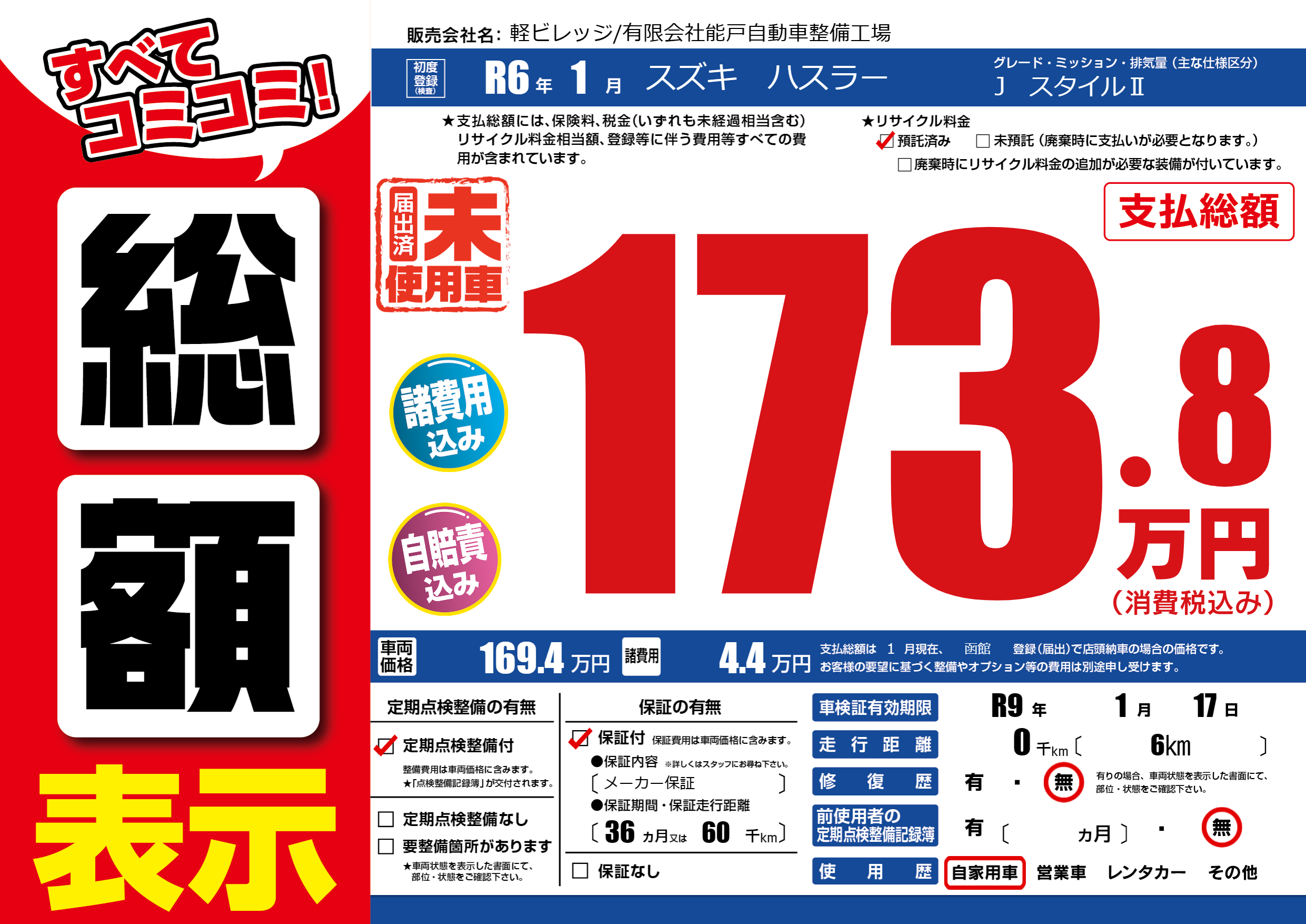 | 車名 | スズキ ハスラー | グレード ミッション 排気量 |