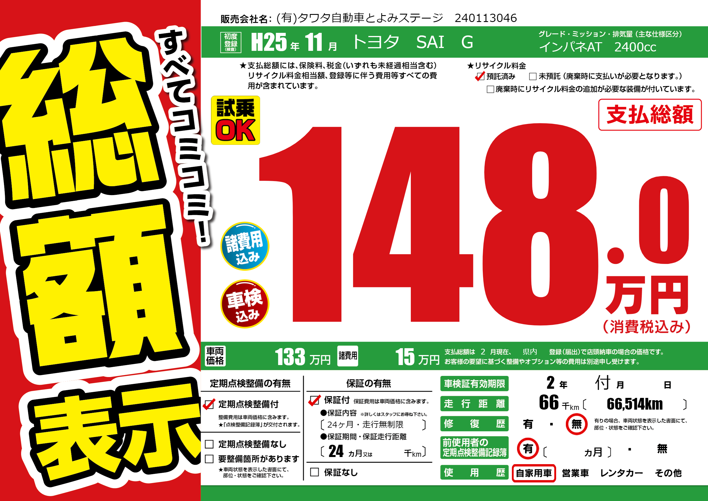 | 車名 | トヨタ SAI G | グレード ミッション 排気量 |